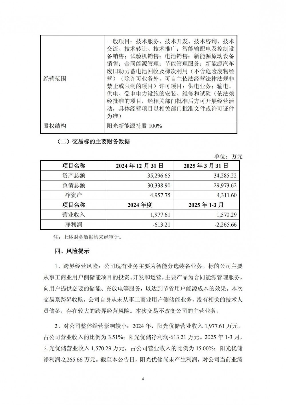 公告显示,阳光优储的控股股东其中阳光新能源为阳光电源旗下子公司,主要从事新能源项目开发业务,而阳光优储主要从事工商业用户侧储能项目的投资、开发和运营,主要是通过合同能源管理服务,向用户提供必要的储能、充放电等服务,以达到节省用户能源成本的效果。数据显示,2024 年,阳光优储营业收入1977.61万元,占泰禾智能营业收入的比例为3.51%,净利润亏损613.21万元。2025年1-3月,阳光优储营业收入1570.29万元,占泰禾智能营业收入的15%,净利润亏损2265.66万元。