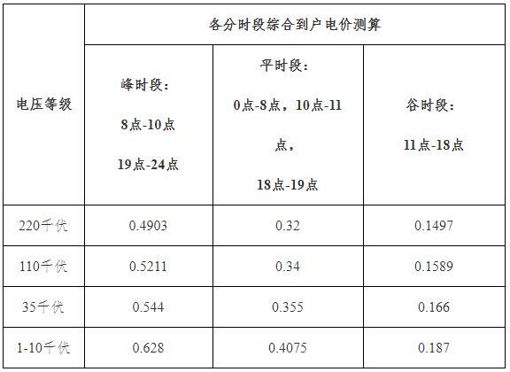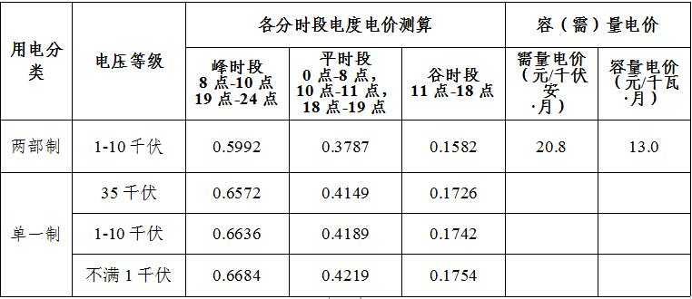 一般工商业用户根据用电容量选择执行单一制或两部制电价。单一制电价由上网电价、电量电价、上网环节线损费用、政府性基金及附加构成,两部制电价由上网电价、电量电价、容(需)量电价、上网环节线损费用、政府性基金及附加构成,其中峰时段、谷时段的上网电价、电量电价上下浮动60%。具体电价测算详见附表: