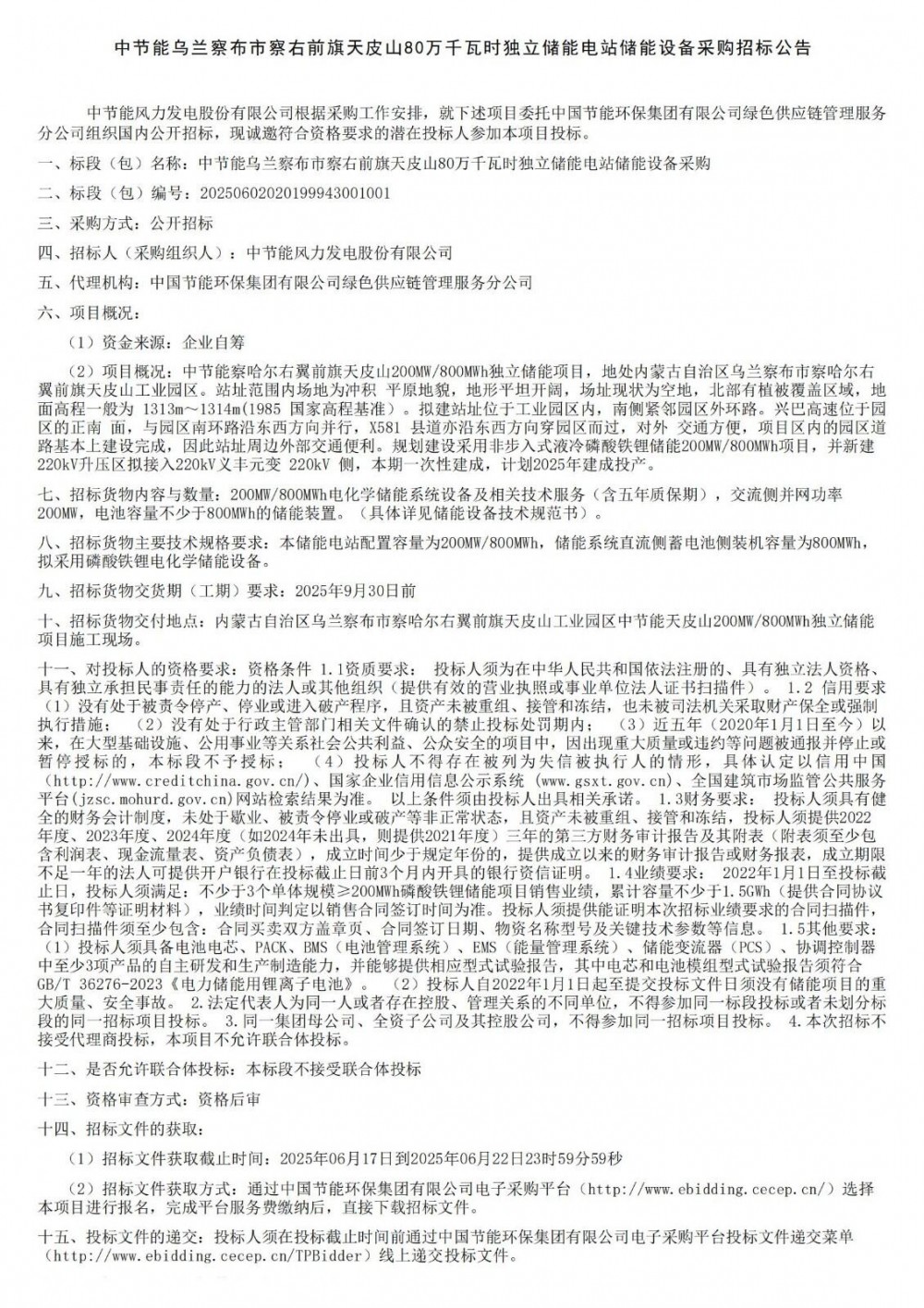6月17日,中节能乌兰察布市察右前旗天皮山80万千瓦时独立储能电站储能设备采购招标公告发布。