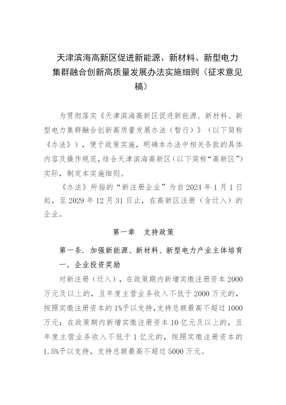 天津滨海高新区促进新能源、新材料、新型电力集群融合创新高质量发展办法(征求意见稿)