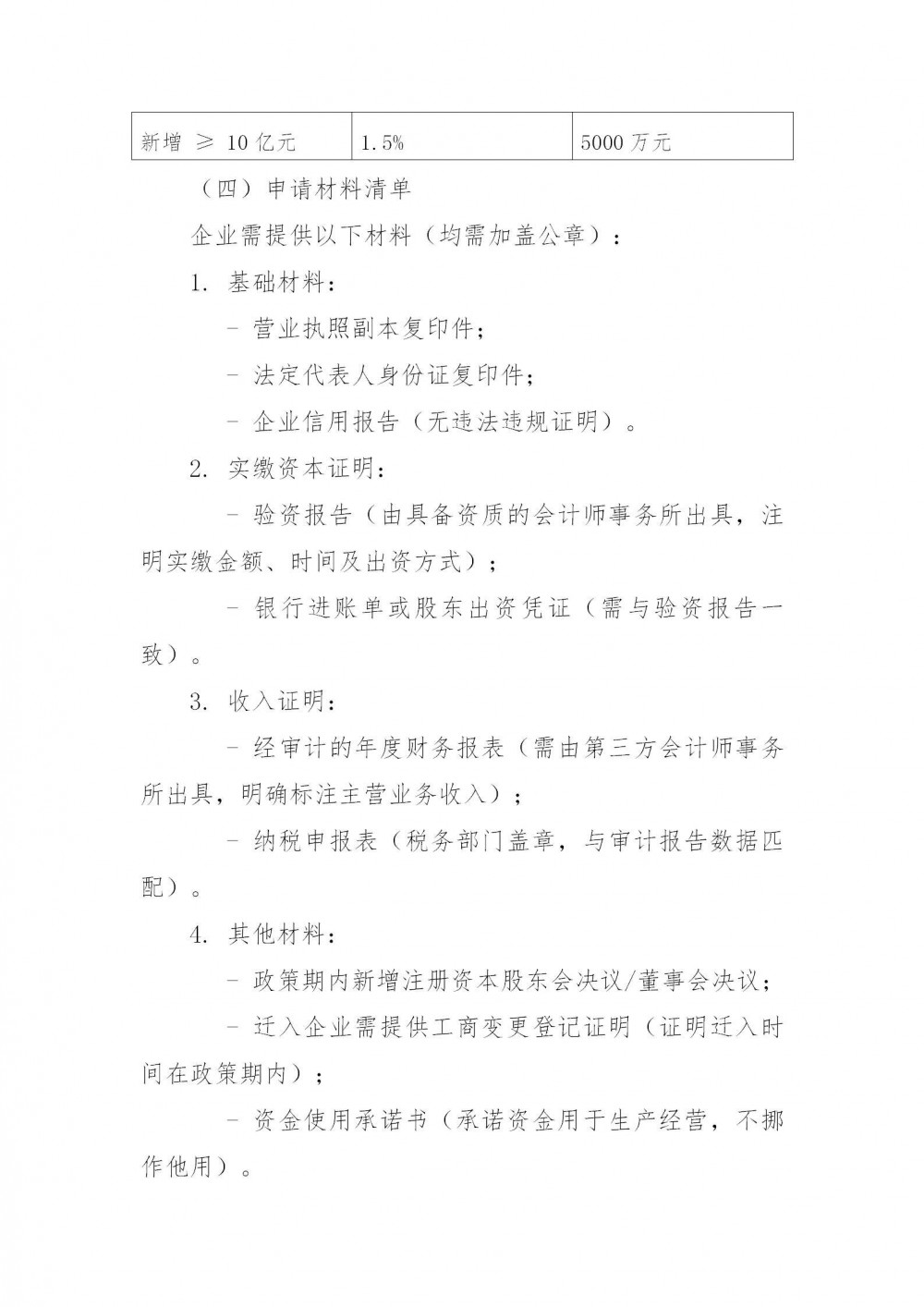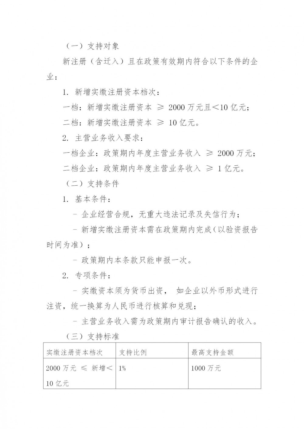 第一条.对新注册(迁入),在政策期内新增实缴注册资本2000万元及以上的,且年度主营业务收入不低于2000万元的,按照实缴注册资本的1%予以支持,支持总额最高不超过1000万元;在政策期内新增实缴注册资本10亿元及以上的,且年度主营业务收入不低于1亿元的,按照实缴注册资本的1.5%予以支持,支持总额最高不超过5000万元。