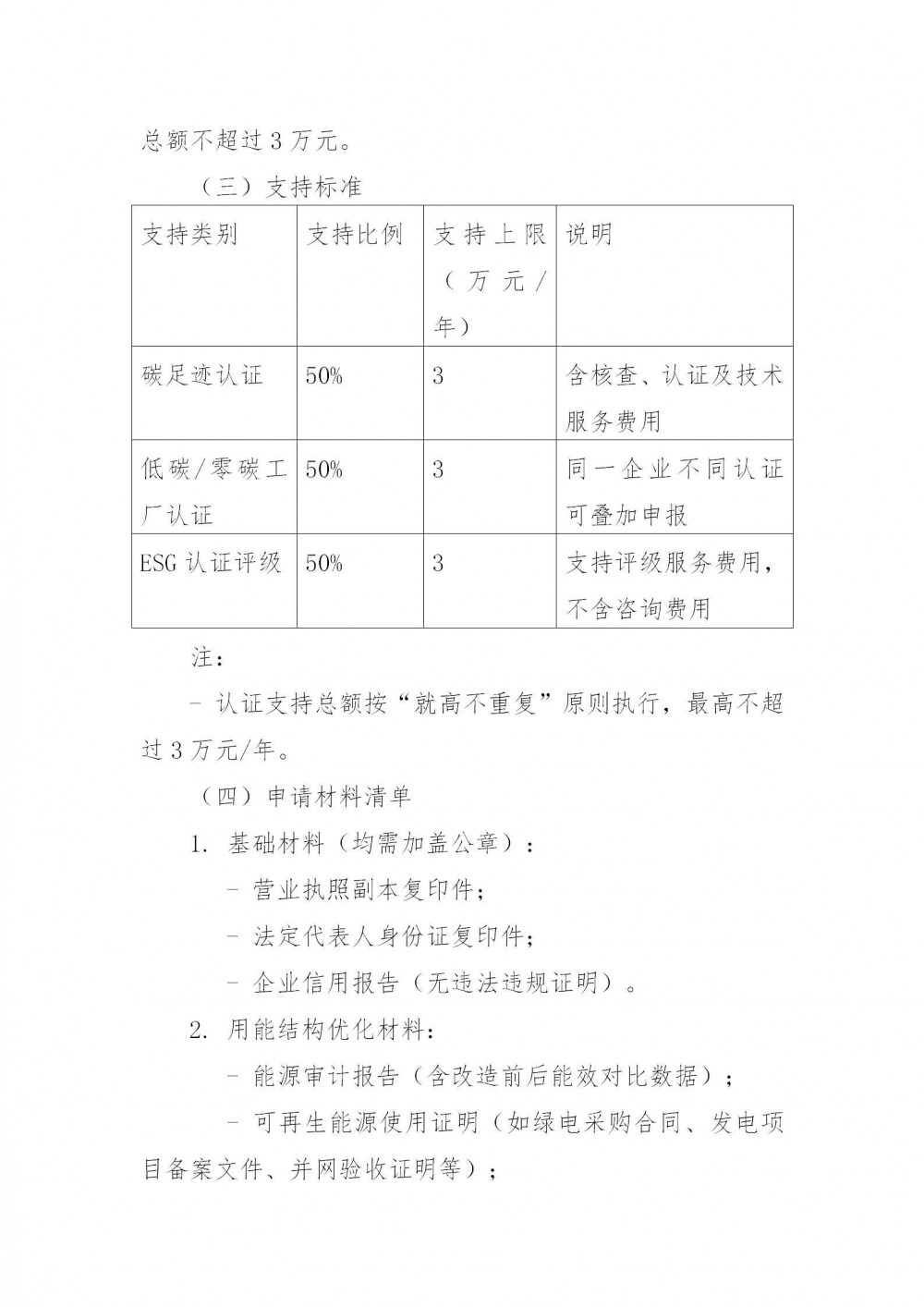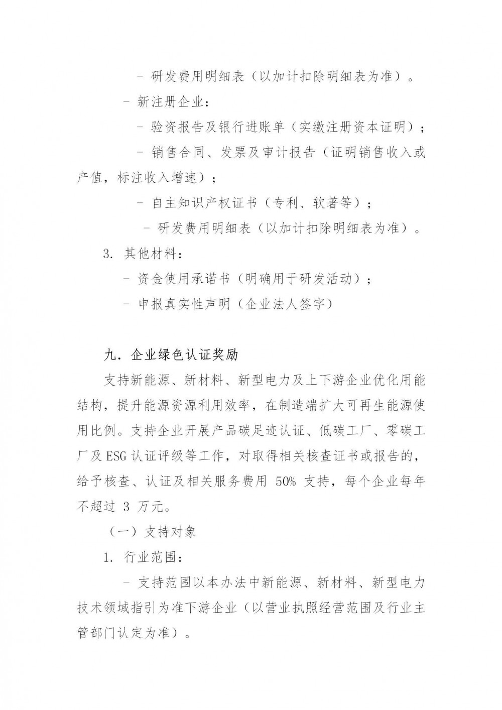 第九条. 支持新能源、新材料、新型电力及上下游企业优化用能结构,提升能源资源利用效率,在制造端扩大可再生能源使用比例。支持企业开展产品碳足迹认证、低碳工厂、零碳工厂及esg认证评级等工作,对取得相关核查证书或报告的,给予核查、认证及相关服务费用 50% 支持,每个企业每年不超过 3 万元。
