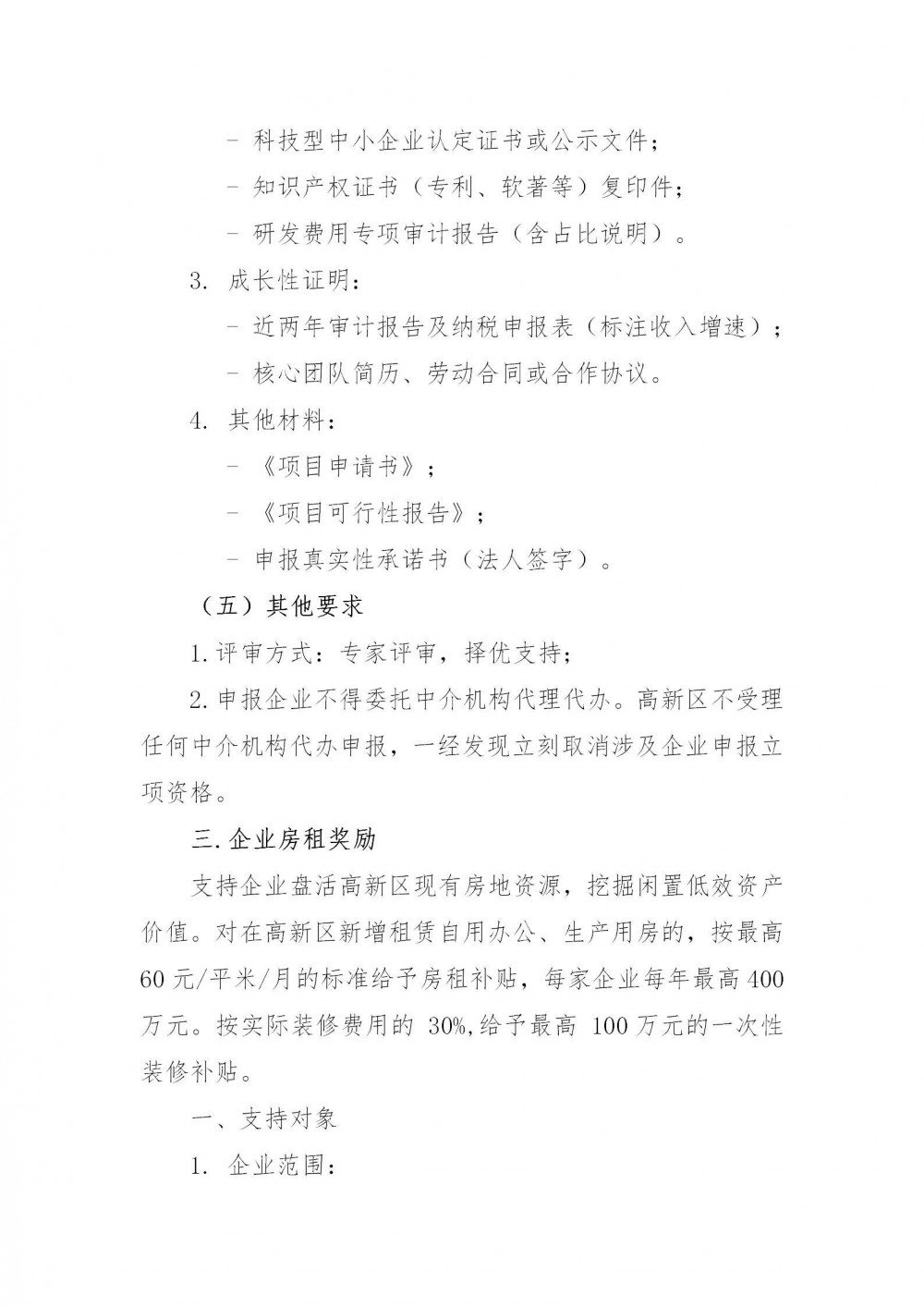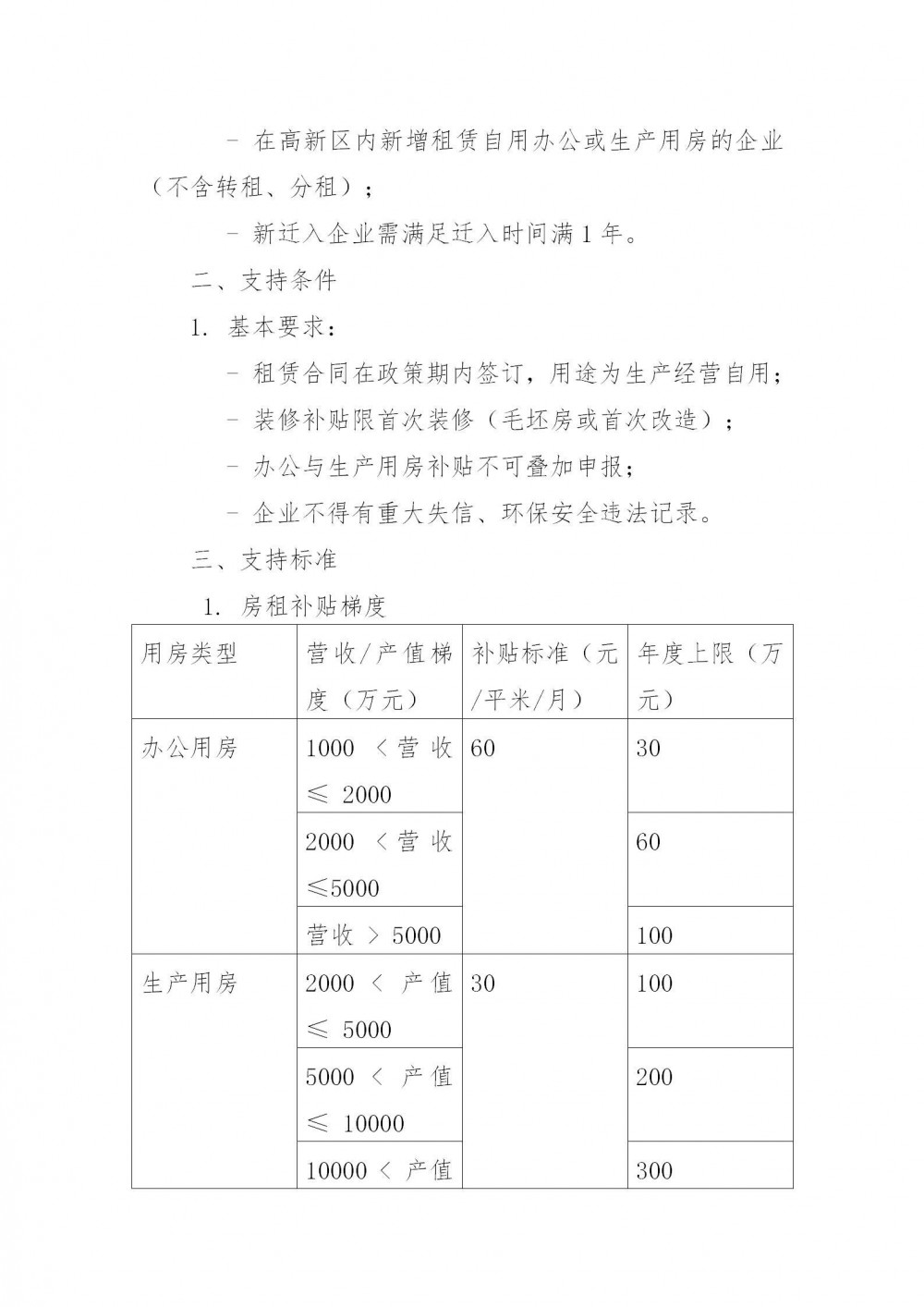 第三条. 支持企业盘活高新区现有房地资源,挖掘闲置低效资产价值。对在高新区新增租赁自用办公、生产用房的,按最高 60元/平米/月的标准给予房租补贴,每家企业每年最高 400万元。按实际装修费用的 30%,给予最高 100万元的一次性装修补贴。