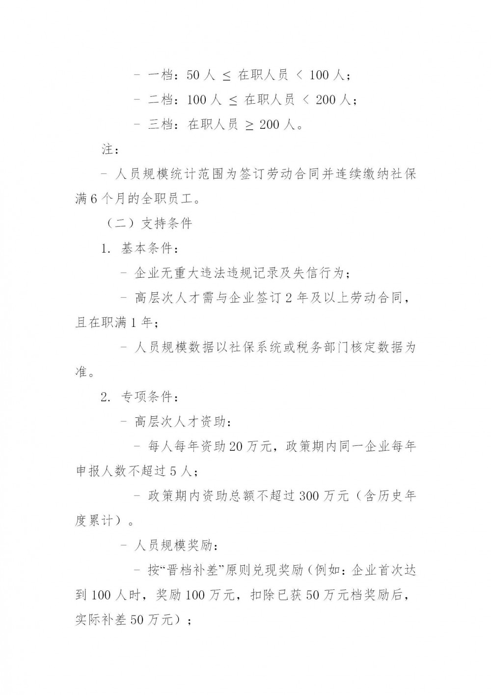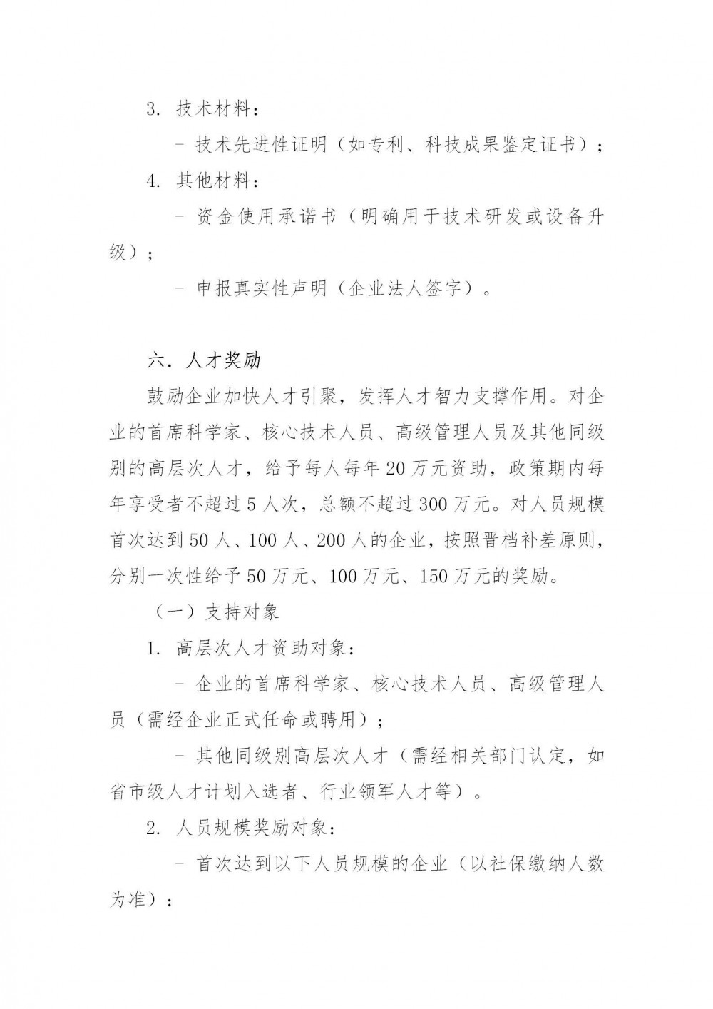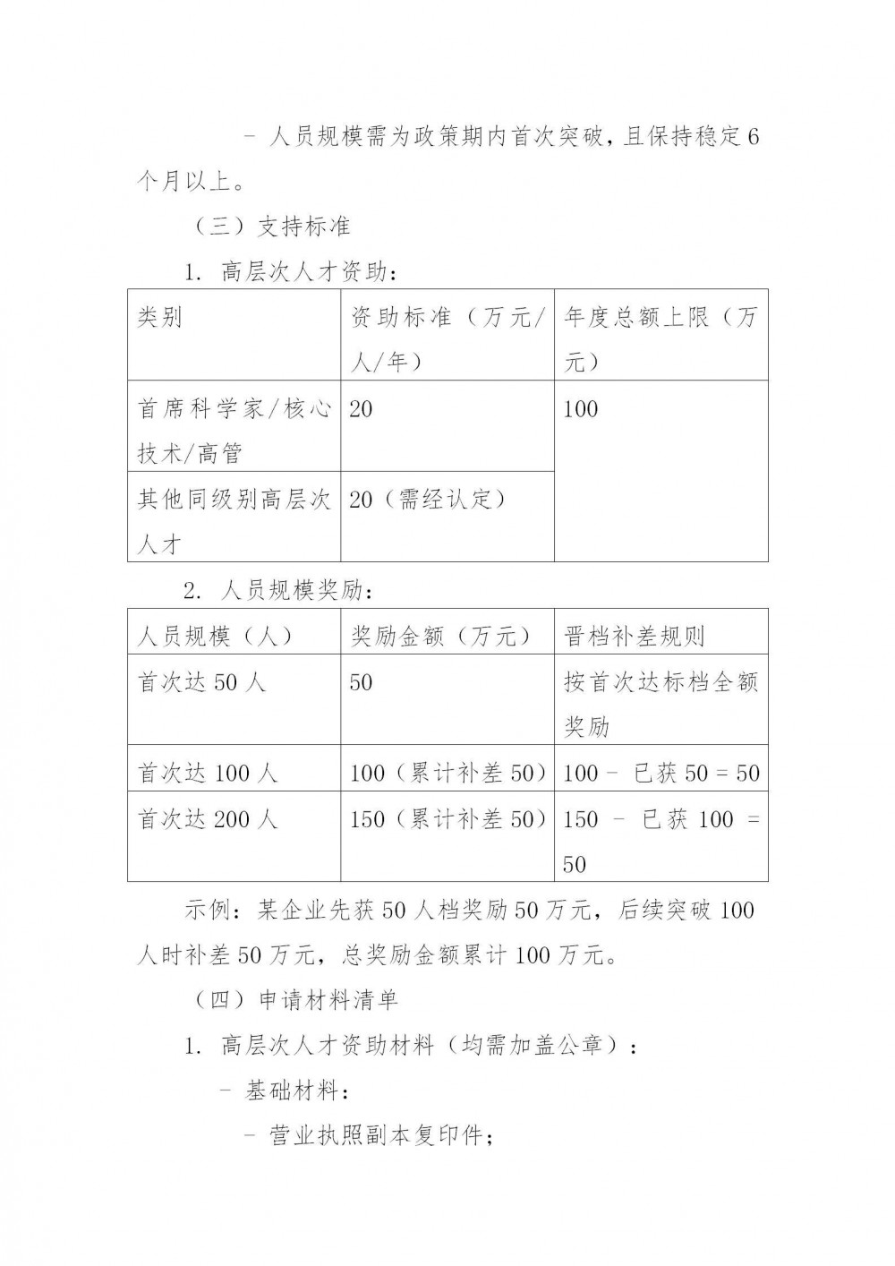 第六条. 鼓励企业加快人才引聚,发挥人才智力支撑作用。对企业的首席科学家、核心技术人员、高级管理人员及其他同级别的高层次人才,给予每人每年20万元资助,政策期内每年享受者不超过5人次,总额不超过300万元。对人员规模首次达到50人、100人、200人的企业,按照晋档补差原则,分别一次性给予50万元、100万元、150万元的奖励。