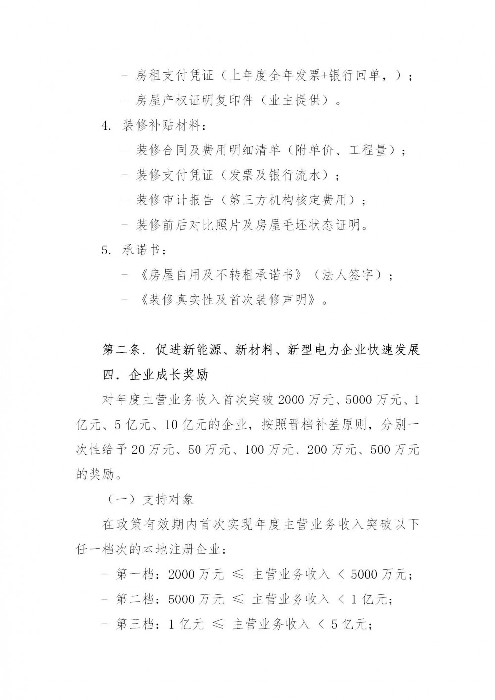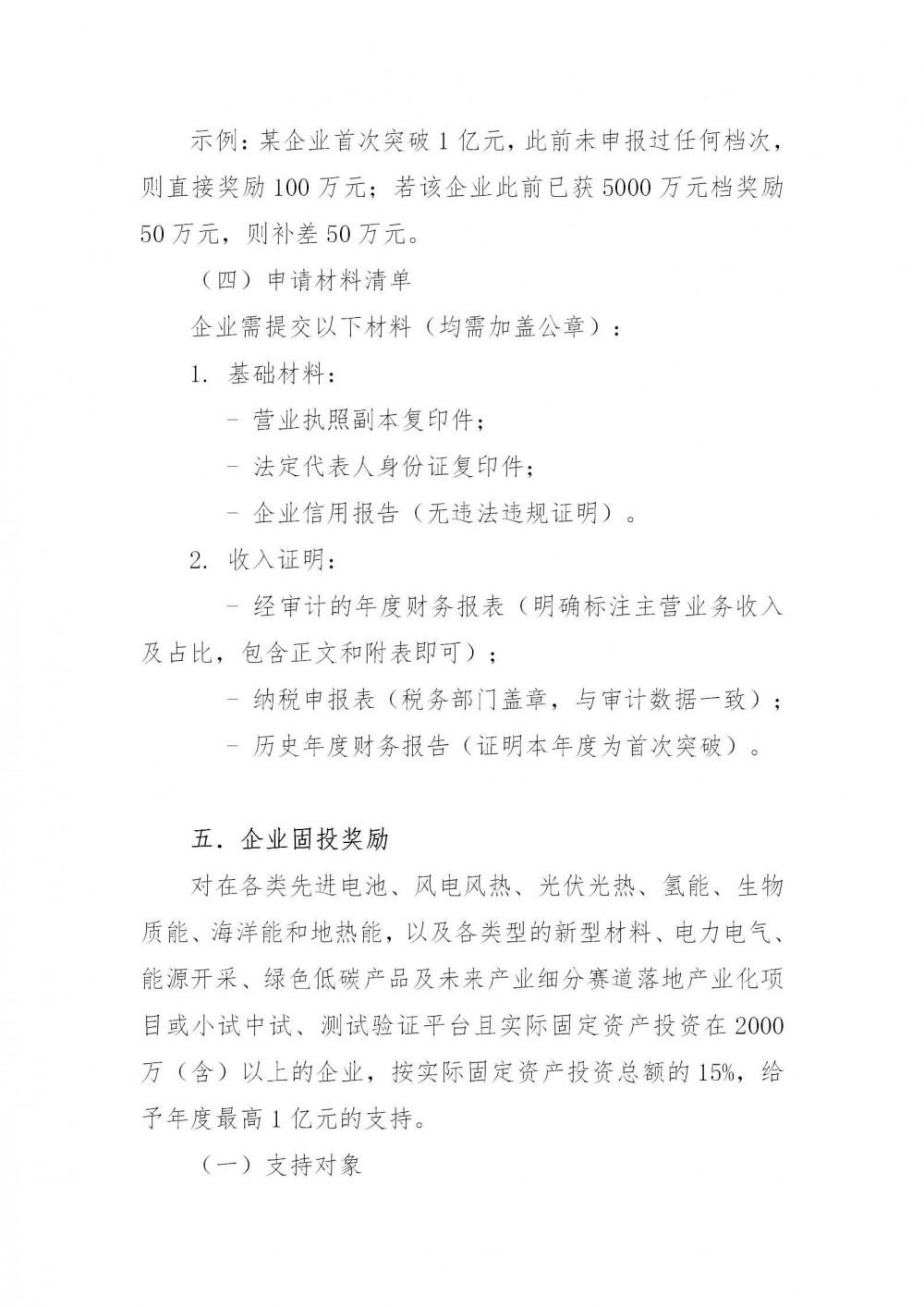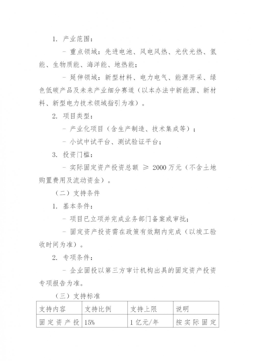 第五条. 对在各类先进电池、风电风热、光伏光热、氢能、生物质能、海洋能和地热能,以及各类型的新型材料、电力电气、能源开采、绿色低碳产品及未来产业细分赛道落地产业化项目或小试中试、测试验证平台且实际固定资产投资在2000万(含)以上的企业,按实际固定资产投资总额的15%,给予年度最高1亿元的支持。