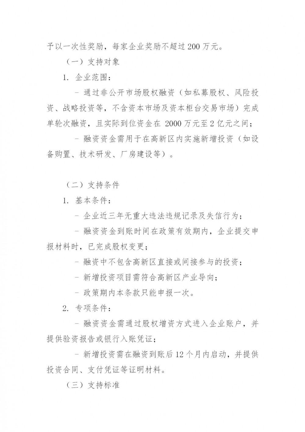 第七条. 鼓励企业进行股权融资(资本市场和资本柜台交易市场除外),对单轮次融资成功获得2千万元至2亿元融资并在高新区实现新增投资的企业按照实际融资到位资金的1%予以一次性奖励,每家企业奖励不超过200万元。