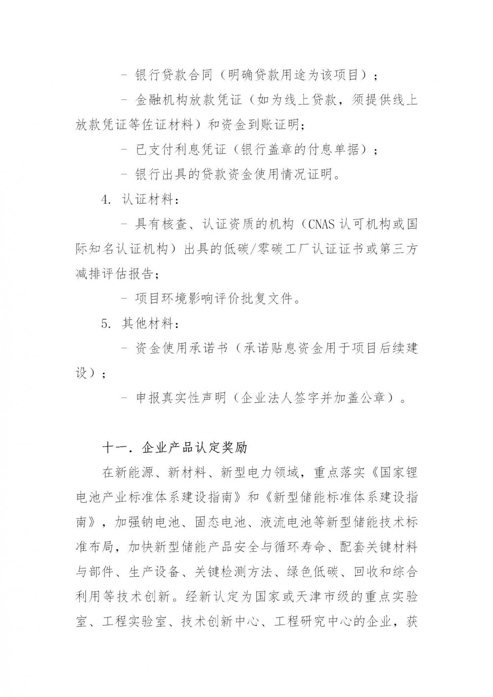 其中《天津滨海高新区促进新能源、新材料、新型电力集群融合创新高质量发展办法》,文件明确,在新能源、新材料、新型电力领域,重点落实《国家锂电池产业标准体系建设指南》和《新型储能标准体系建设指南》,加强钠电池、固态电池、液流电池等新型储能技术标准布局,加快新型储能产品安全与循环寿命、配套关键材料与部件、生产设备、关键检测方法、绿色低碳、回收和综合利用等技术创新。经新认定为国家或天津市级的重点实验室、工程实验室、技术创新中心、工程研究中心的企业,获得国家级各类奖项、产品认定,以及列入国家各部委发布的国之重器、制造业单项冠军、国家重点新产品、中央企业科技创新成果、行业准入名单、揭榜挂帅名单的企业,对于获得国家级的给予100万元的一次性资金支持,对于获得天津市级的给予50万元的一次性资金支持。