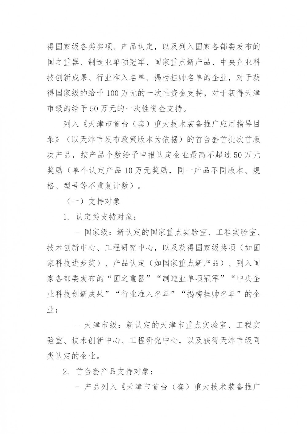 列入《天津市首台(套)重大技术装备推广应用指导目录》(以天津市发布政策版本为依据)的首台套首批次首版次产品,按产品个数给予申报认定企业最高不超过50万元奖励(单个认定产品10万元奖励,同一产品不同版本、规格、型号等不重复计数)。