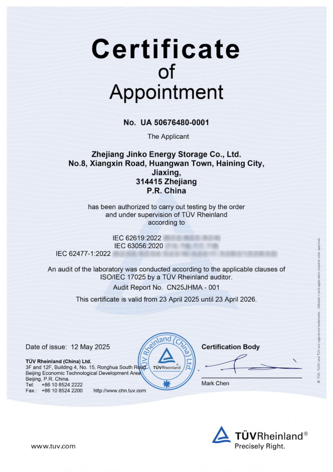 此次授权,意味着晶科储能检测中心可在tüv莱茵技术专家的监督下,于企业实验室内完成相关产品的测试和认证流程。该合作机制不仅有助于提升检测效率,缩短认证周期,同时也有助于企业在研发与市场准入环节中有效控制成本、加快产品推向市场进程。