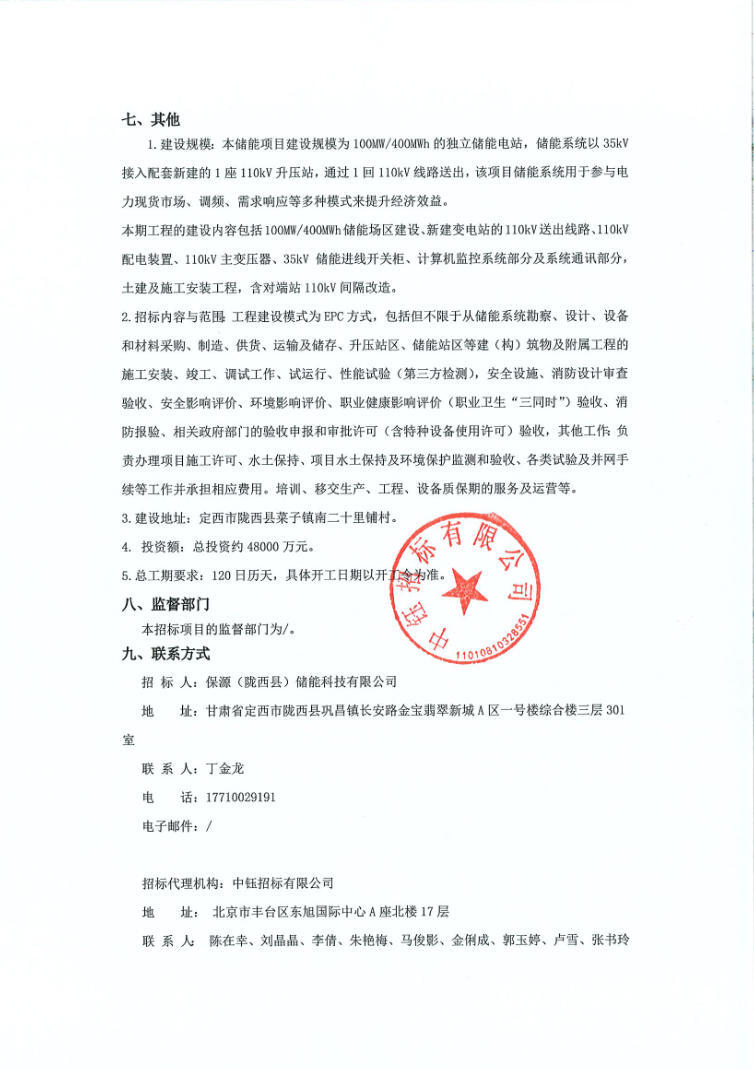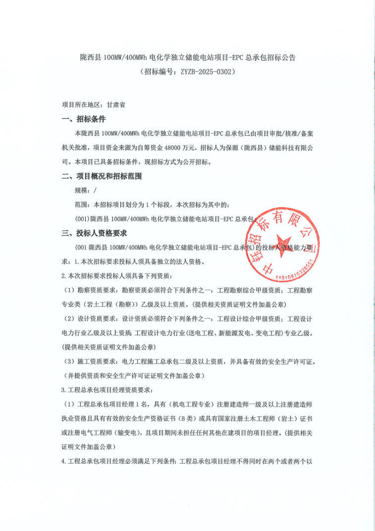 6月19日,陇西县100mw/400mwh电化学独立储能电站项目-epc总承包招标公告发布。