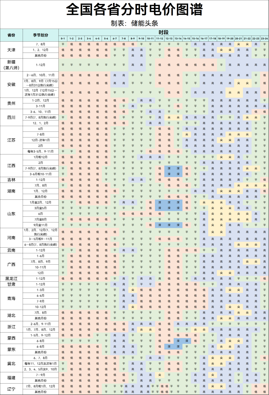 此外,浙江、辽宁、冀北、青海、云南、蒙东、蒙西、新疆、山东、甘肃、河南、陕西等地设置午间谷段,时长在1-8小时之间。