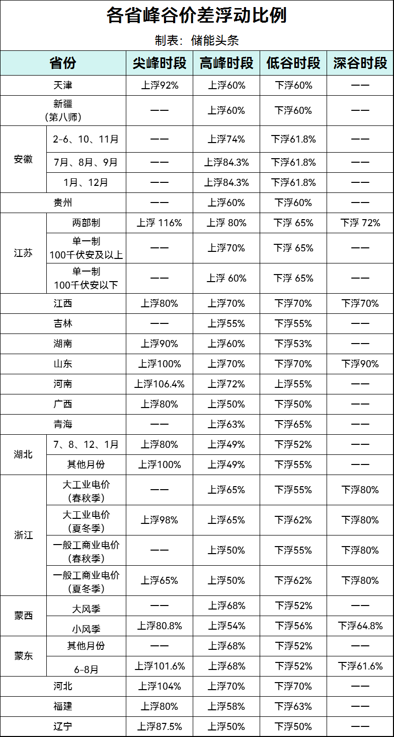 储能头条还注意到,新一轮分时电价政策的灵活性也在进一步提升。除吉林、四川拟灵活启动尖峰电价外,安徽和四川计划建立分时电价动态调整机制。安徽提出,电网公司根据省内电力供需形势、电源结构、电力负荷变化及系统调节能力等情况合理确定峰谷具体时段,以年度为周期,提前向社会公布未来12个月的峰谷时段情况。此前,山东已建立分时电价动态调整机制,电网公司于年底公布下一年度的峰谷时段。