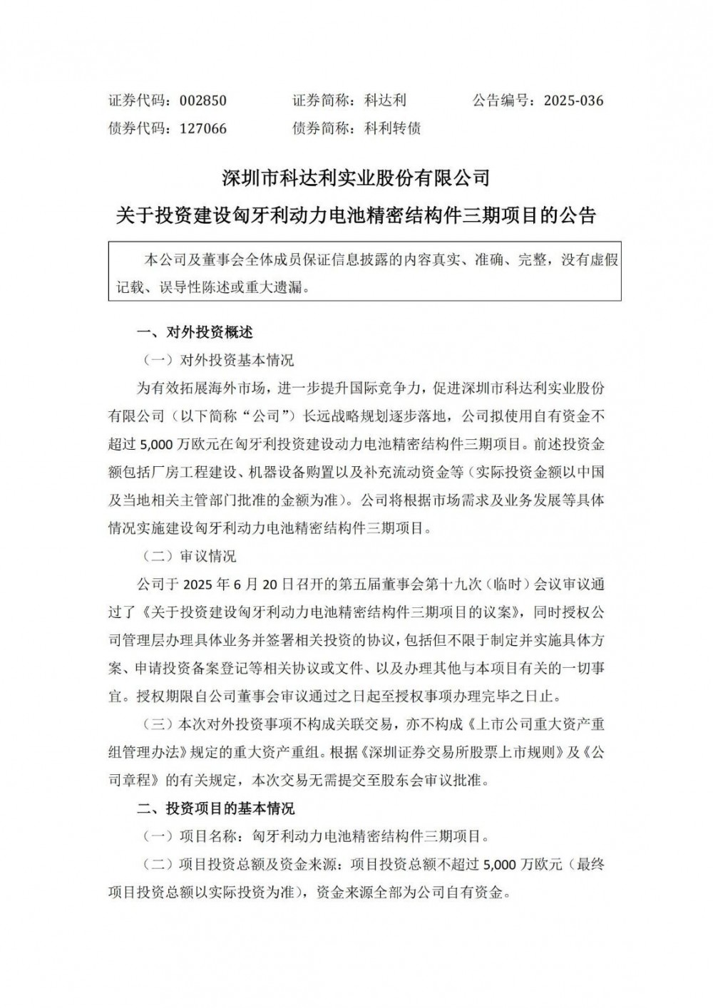 6月20日,科利达发布公告称,公司拟使用自有资金不超过5,000万欧元在匈牙利投资建设动力电池精密结构件三期项目。
