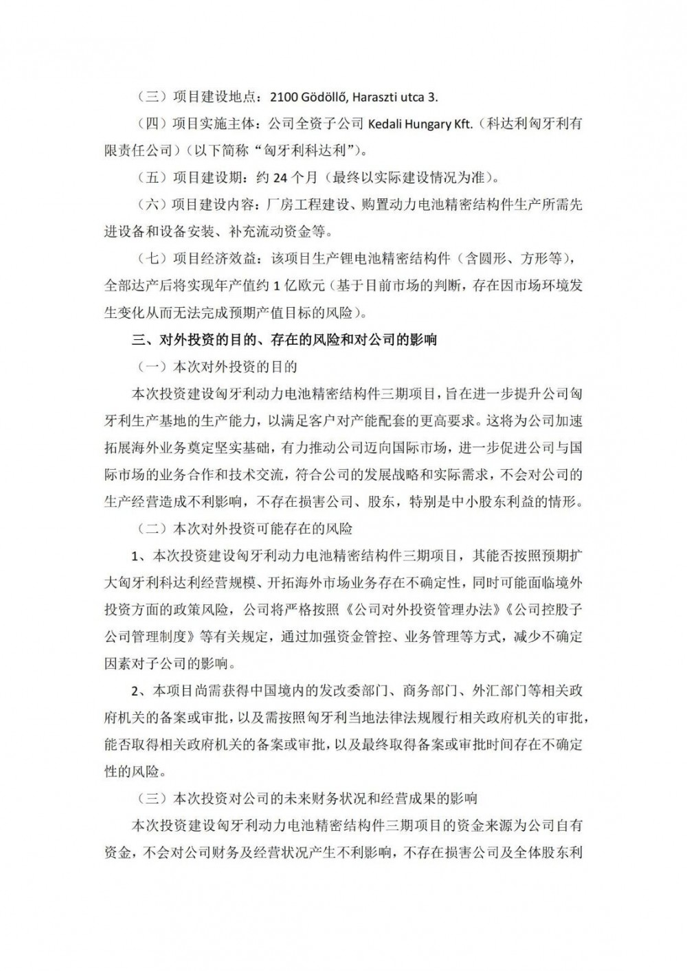 科利达表示,本次投资建设匈牙利动力电池精密结构件三期项目,旨在进一步提升公司匈牙利生产基地的生产能力,以满足客户对产能配套的更高要求。这将为公司加速拓展海外业务奠定坚实基础,有力推动公司迈向国际市场,进一步促进公司与国际市场的业务合作和技术交流,符合公司的发展战略和实际需求,不会对公司的生产经营造成不利影响,不存在损害公司、股东,特别是中小股东利益的情形。