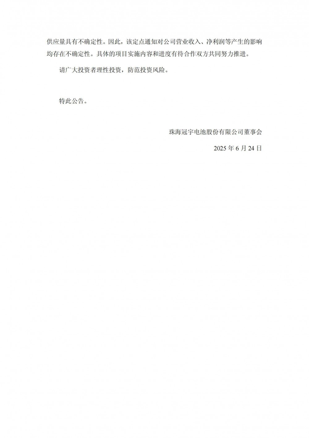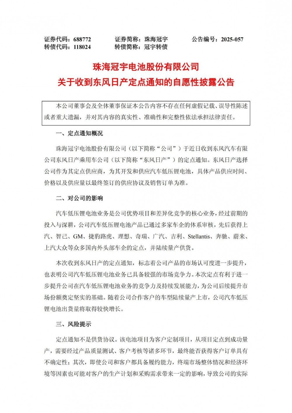 6月23日,珠海冠宇发布公告称,公司于近日收到东风汽车有限公司东风日产乘用车公司的定点通知。东风日产选择公司作为其定点供应商,为其开发和供应汽车低压锂电池,具体产品供应时间、价格以及供应量以最终签订的供应协议及销售订单为准。