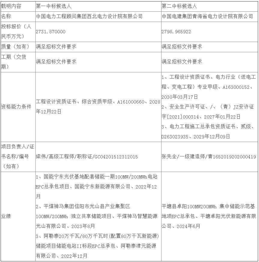 第一中标候选人为中国电力工程顾问集团西北电力设计院有限公司,投标报价2731.87万元;第二中标候选人为中国电建集团青海省电力设计院有限公司,投标报价2798.965922万元。