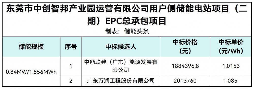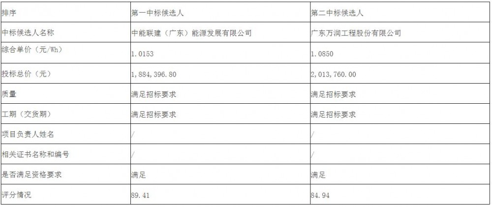 第一中标候选人为中能联建(广东)能源发展有限公司,投标报价1884396.8元,折合单价1.0153元/wh;第二中标候选人为广东万润工程股份有限公司,投标报价2013760元,折合单价1.085元/wh。
