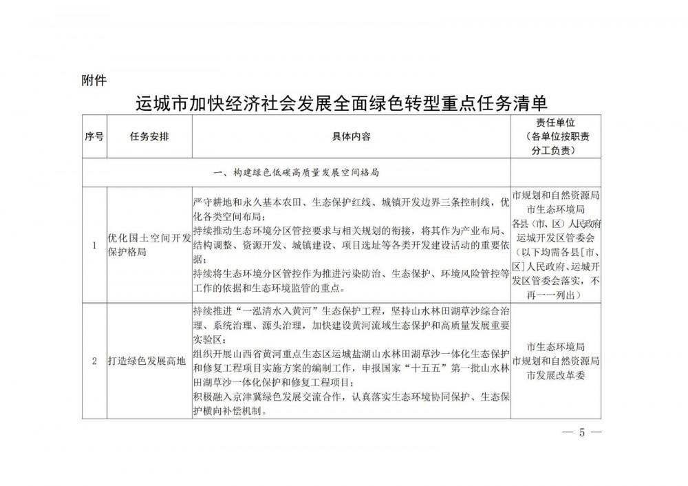 运城市人民政府办公室关于印发《运城市加快经济社会发展全面绿色转型重点任务清单》的通知