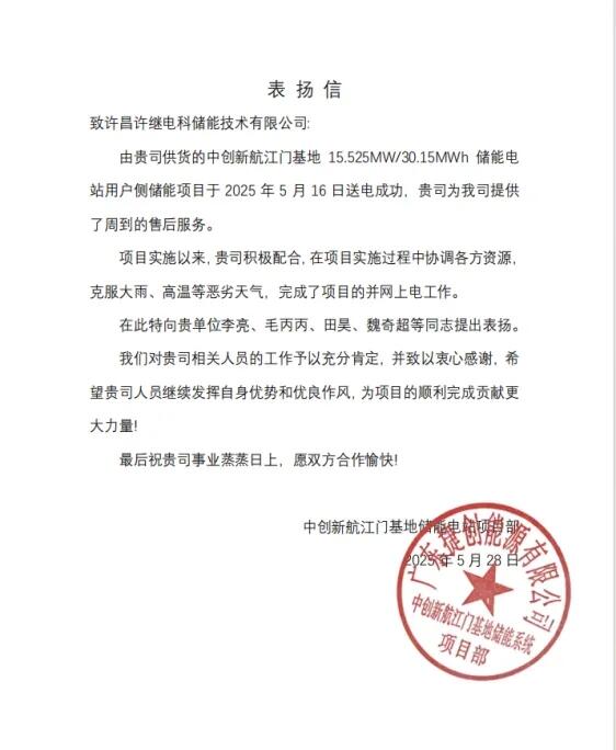 2025年5月16日,中创新航江门基地15.525mw/30.15mwh用户侧储能项目成功送电。项目位于广东省江门市新会区,许继电科储能为该项目提供了2套一次设备舱以及二次设备等。