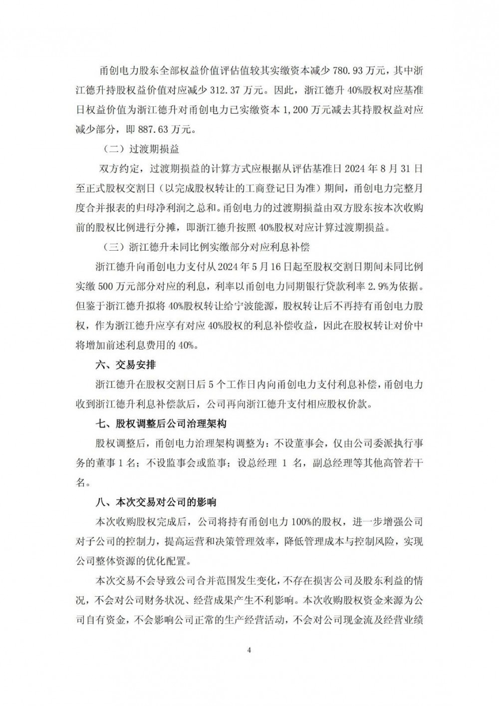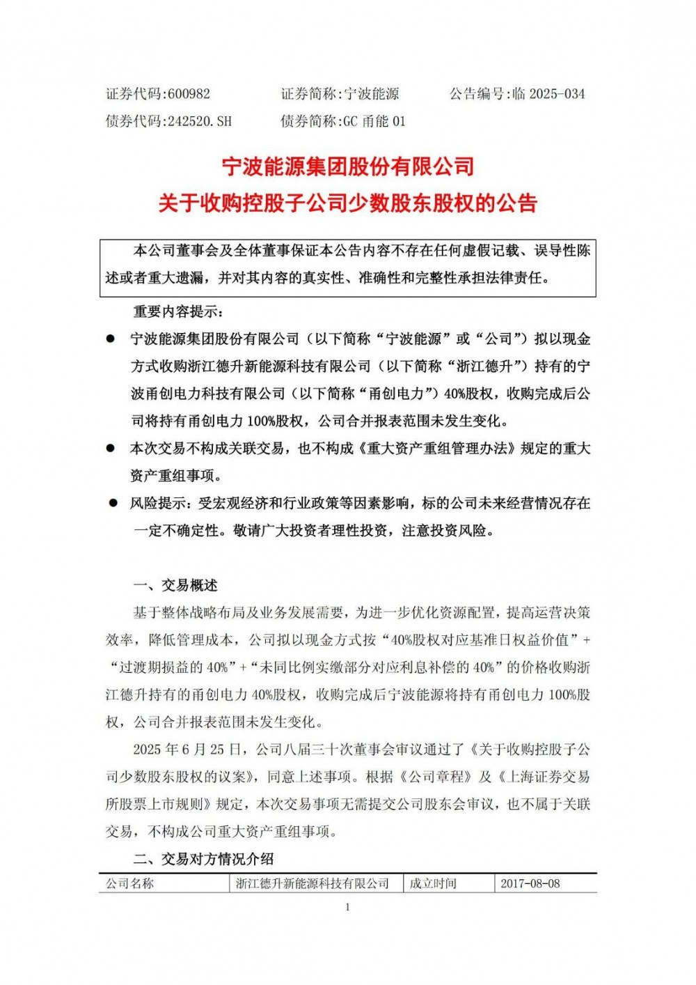 6月25日,宁波能源披露收购控股子公司少数股东股权的公告,宣布拟以现金方式收购浙江德升新能源科技有限公司持有的宁波甬创电力科技有限公司(以下简称“甬创电力”)40%股权,收购完成后公司将持有甬创电力100%股权,公司合并报表范围未发生变化。