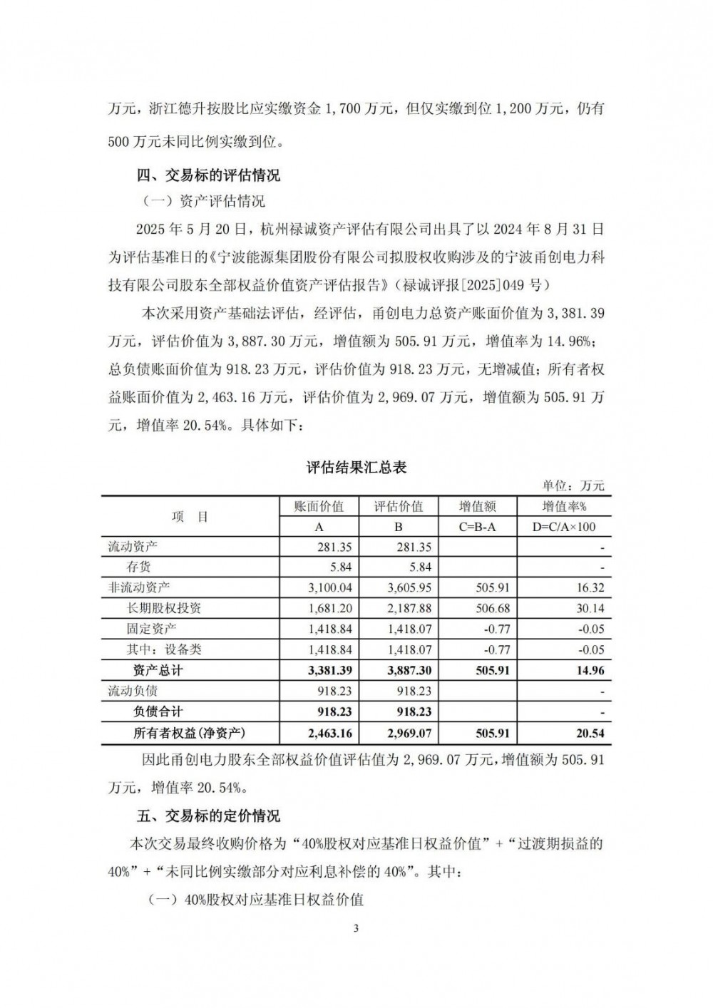 经评估,甬创电力总资产账面价值为3,381.39万元,评估价值为3,887.30万元,增值额为505.91万元,增值率为14.96%;总负债账面价值为918.23万元,评估价值为918.23万元,无增减值;所有者权益账面价值为2,463.16万元,评估价值为2,969.07万元,增值额为505.91万元,增值率20.54%。