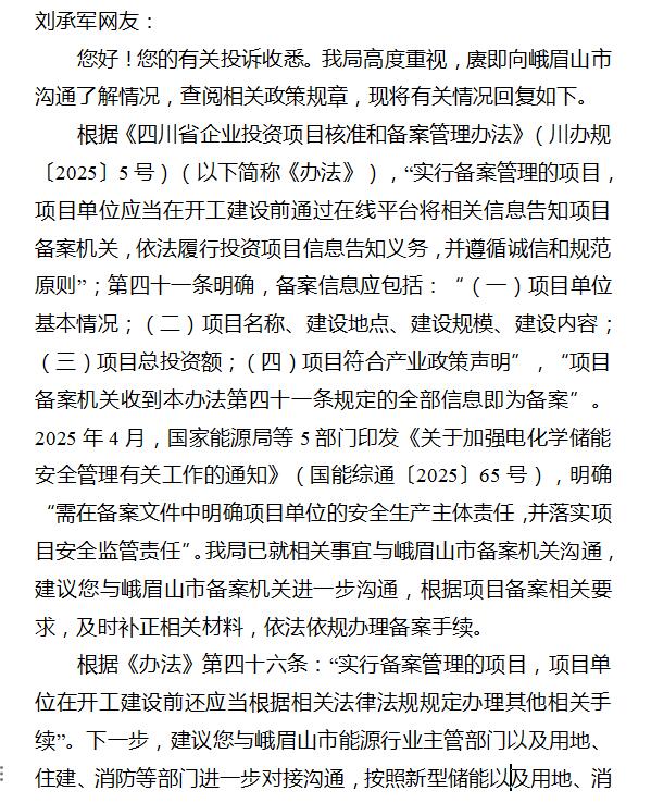 四川省发改委在回复时表示,2025年4月,国家能源局等5部门印发《关于加强电化学储能安全管理有关工作的通知》(国能综通〔2025〕65号),明确“需在备案文件中明确项目单位的安全生产主体责任,并落实项目安全监管责任”。四川省发改委已就相关事宜与峨眉山市备案机关沟通,建议您与峨眉山市备案机关进一步沟通,根据项目备案相关要求,及时补正相关材料,依法依规办理备案手续。