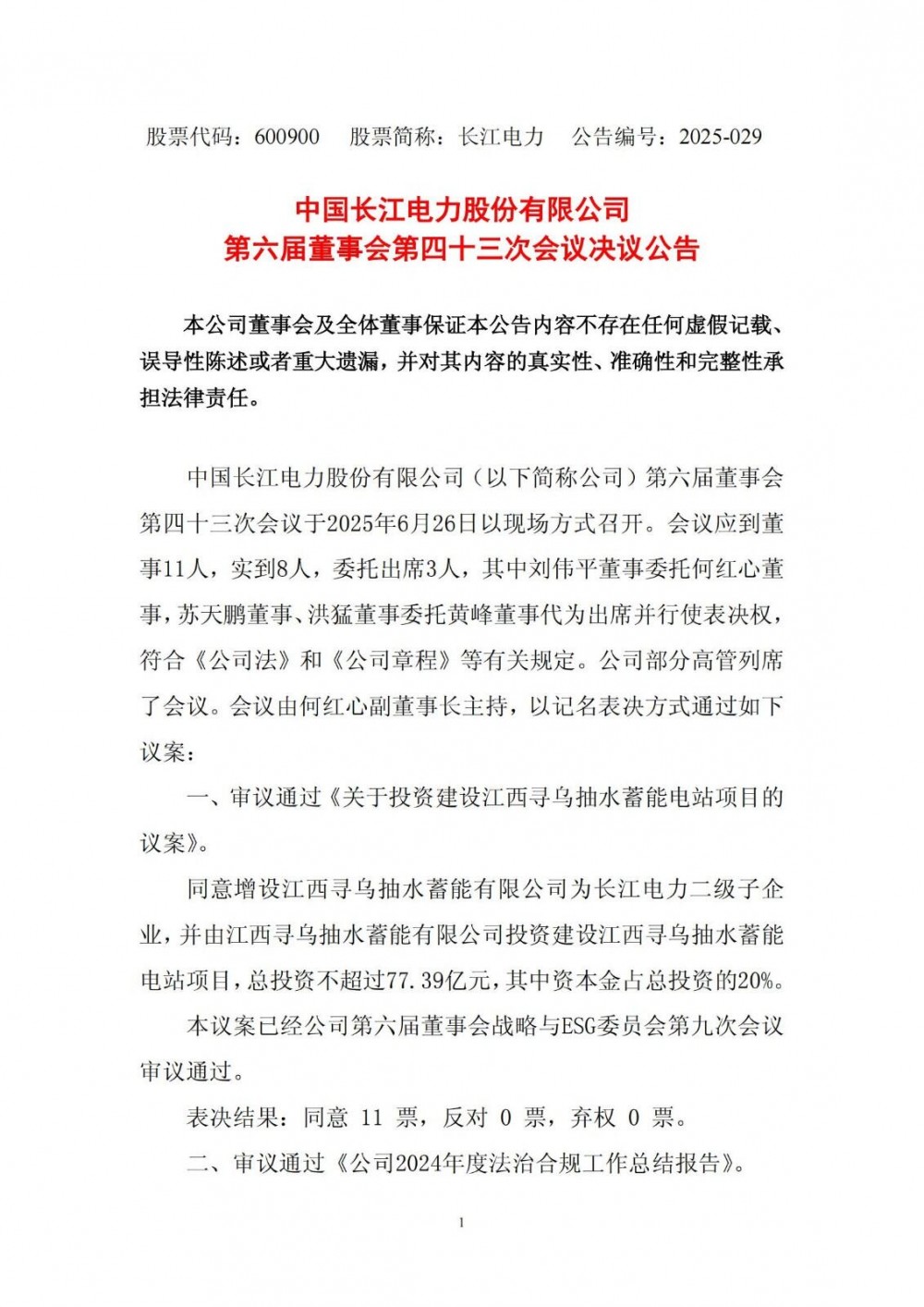 6月27日,长江电力发布公告称,同意增设江西寻乌抽水蓄能有限公司为长江电力二级子企业,并由江西寻乌抽水蓄能有限公司投资建设江西寻乌抽水蓄能电站项目,总投资不超过77.39亿元,其中资本金占总投资的20%。