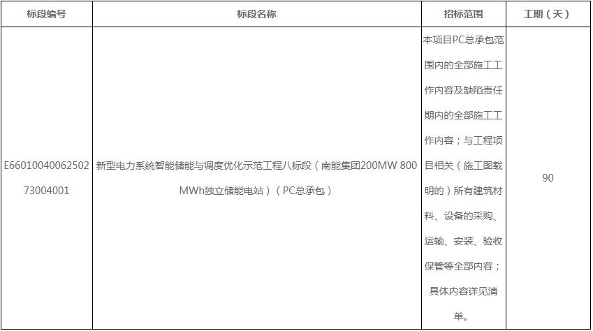 新型电力系统智能储能与调度优化示范工程八标段(南能集团200mw 800mwh独立储能电站)(pc总承包) 招标公告