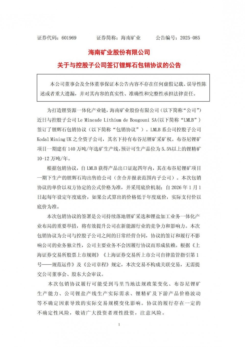 海南矿业表示,本次包销协议的签署是公司持续落地锂矿采选和锂盐加工业务一体化产业布局的重要举措,将有效提升公司在新能源行业的竞争力和影响力。本次包销协议为公司与控股子公司之间的日常经营合同,协议的签订和履行不影响公司的业务独立性,公司主要业务不会因履行协议而形成依赖。