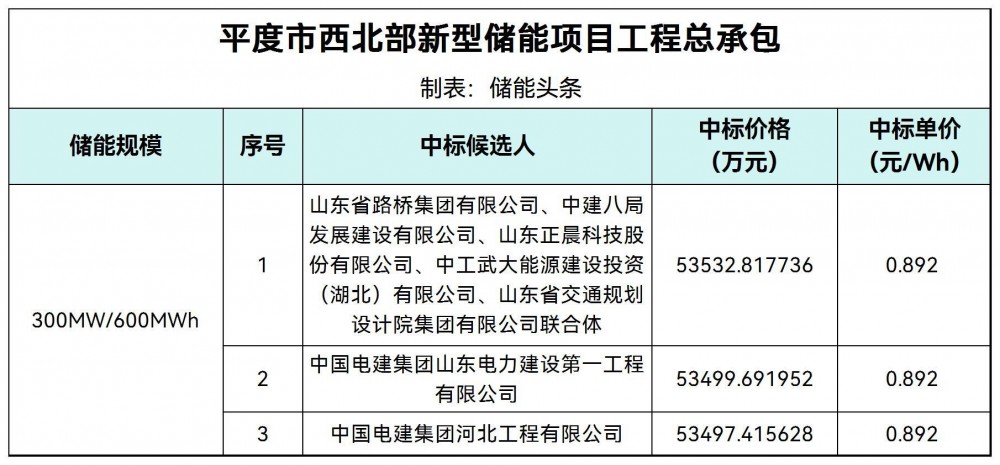 第一中标候选人为山东省路桥集团有限公司、中建八局发展建设有限公司、山东正晨科技股份有限公司、中工武大能源建设投资(湖北)有限公司、山东省交通规划设计院集团有限公司联合体,投标总价53532.817736万元,折合单价0.8922元/wh;第二中标候选人为中国电建集团山东电力建设第一工程有限公司,投标总价53499.691952万元,折合单价0.8917元/wh;第三中标候选人为中国电建集团河北工程有限公司,投标总价53497.415628万元,折合单价0.8916元/wh。