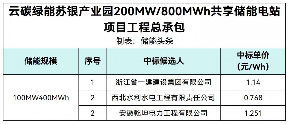 第一中标候选人为浙江省一建建设集团有限公司,折合单价1.14元/wh;第二中标候选人为西北水利水电工程有限责任公司,折合单价0.768元/wh;第三中标候选人为安徽乾坤电力工程有限公司,折合单价1.251元/wh。