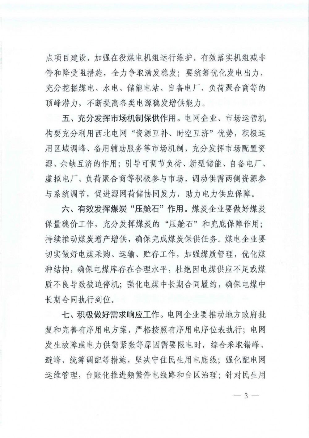 文件明确,充分发挥市场机制保供作用。电网企业、市场运营机构要充分利用西北电网“资源互补、时空互济”优势,积极运用区域调峰、备用辅助服务等市场机制,充分发挥市场配置资源、余缺互济的作用;引导可调节负荷、新型储能、自备电厂、虚拟电厂、负荷聚合商等积极参与市场,调动供需两侧资源参与系统调节,促进源网荷储协同发力,助力电力供应保障。