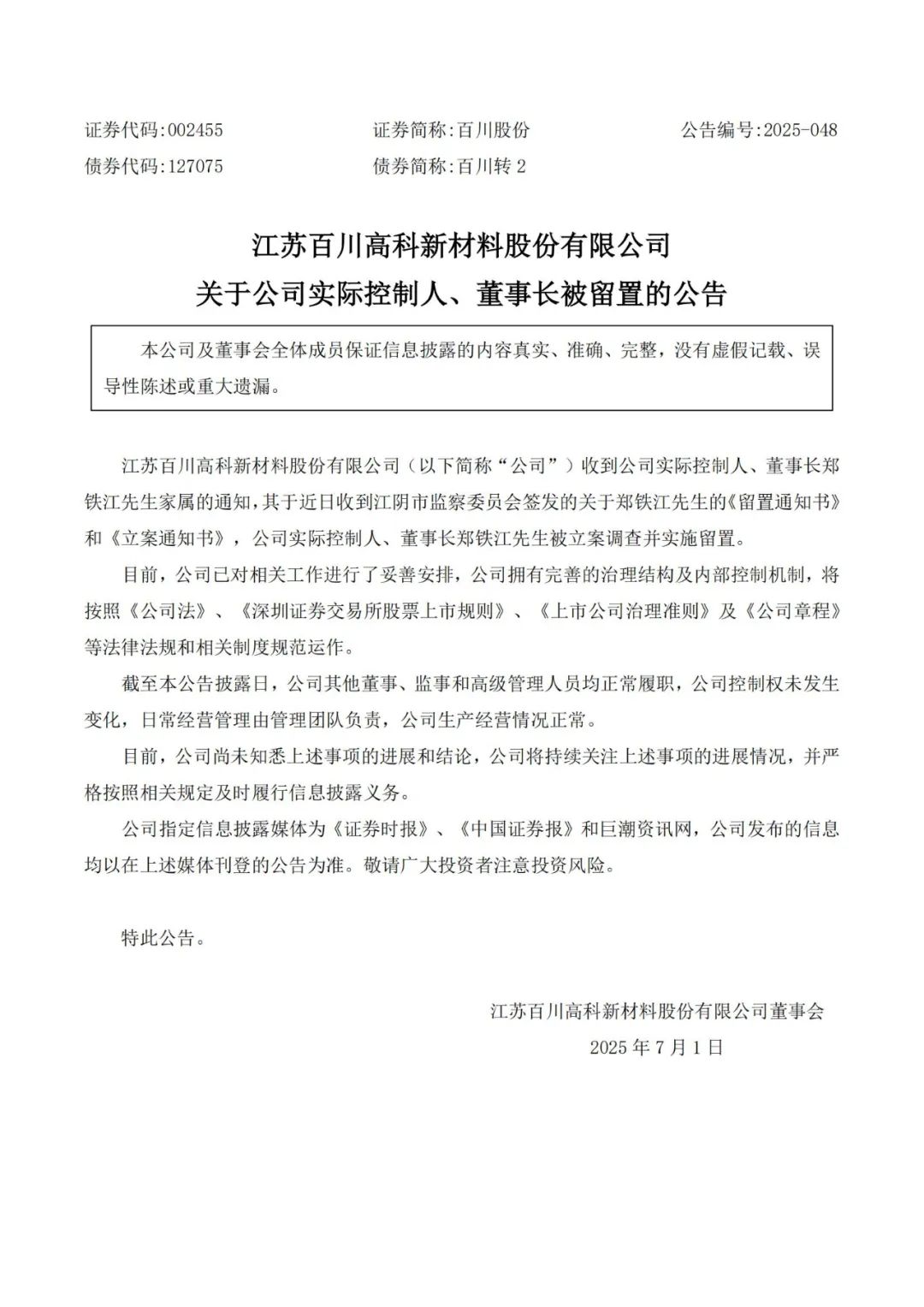 发布公告称,公司收到实际控制人、董事长郑铁江家属的通知,其于近日收到江阴市监察委员会签发的关于郑铁江的《留置通知书》和《立案通知书》,郑铁江被立案调查并实施留置。