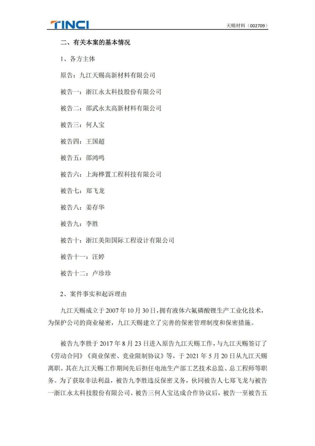 公告披露,原告九江天赐拥有液体六氟磷酸锂生产工业化技术,为保护公司的商业秘密,九江天赐建立了完善的保密管理制度和保密措施。被告九李胜于2017年8月23日进入九江天赐工作,与九江天赐签订了《劳动合同》《商业保密、竞业限制协议》等,于2021年5月20日从九江天赐离职。其在九江天赐工作期间先后担任电池生产部工艺技术总监、总工程师等职务。为了获取非法利益,被告九李胜违反保密义务,伙同被告人七郑飞龙与被告一浙江永太科技股份有限公司、被告三何人宝达成合作协议后,被告一至被告五将其通过收买的不正当手段非法获取的原告液体六氟磷酸锂工艺技术资料运用于被告二邵武永太高新材料有限公司年产13.4万吨液体锂盐产业化项目中。该项目由被告四王国超、被告五邵鸿鸣具体负责,并由被告十浙江美阳国际工程设计有限公司进行项目产线设计,并由被告六上海桦置工程科技有限公司(该公司由郑飞龙、被告八姜存华与何人宝成立,实控人为何人宝)承接项目部分。