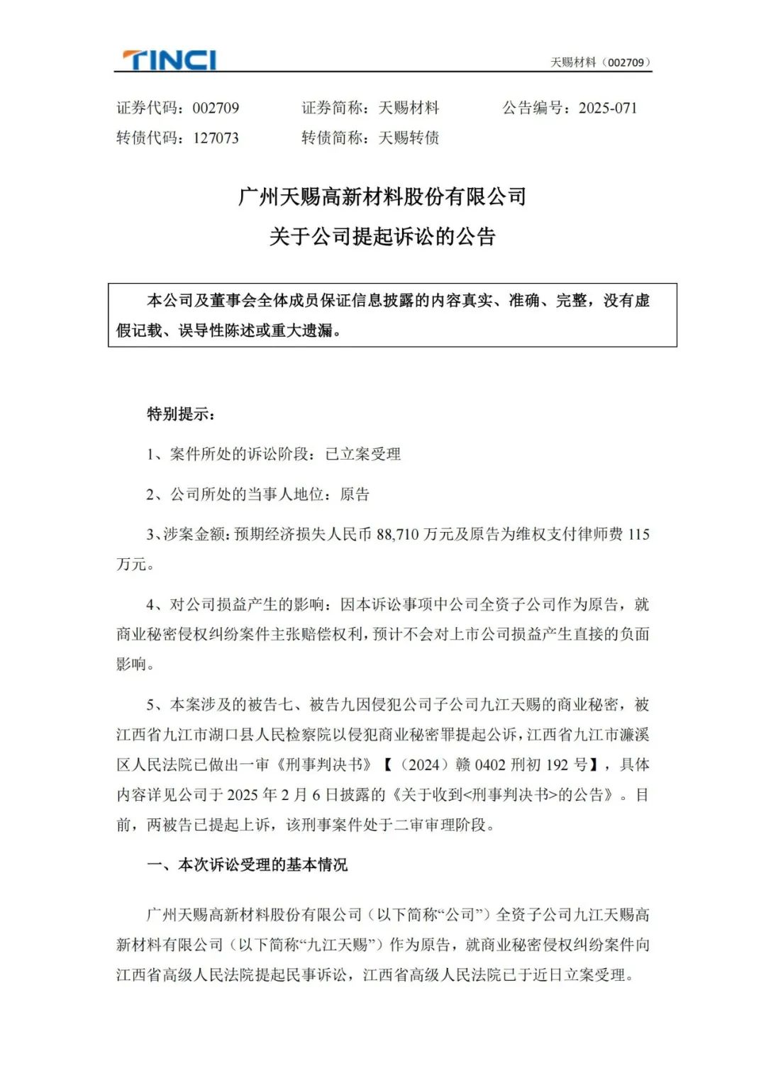 发布公告称,公司全资子公司九江天赐作为原告,就商业秘密侵权纠纷案件向江西省高级人民法院提起民事诉讼,江西省高级人民法院已于近日立案受理,涉案金额预期经济损失8.87亿元及律师费115万元。