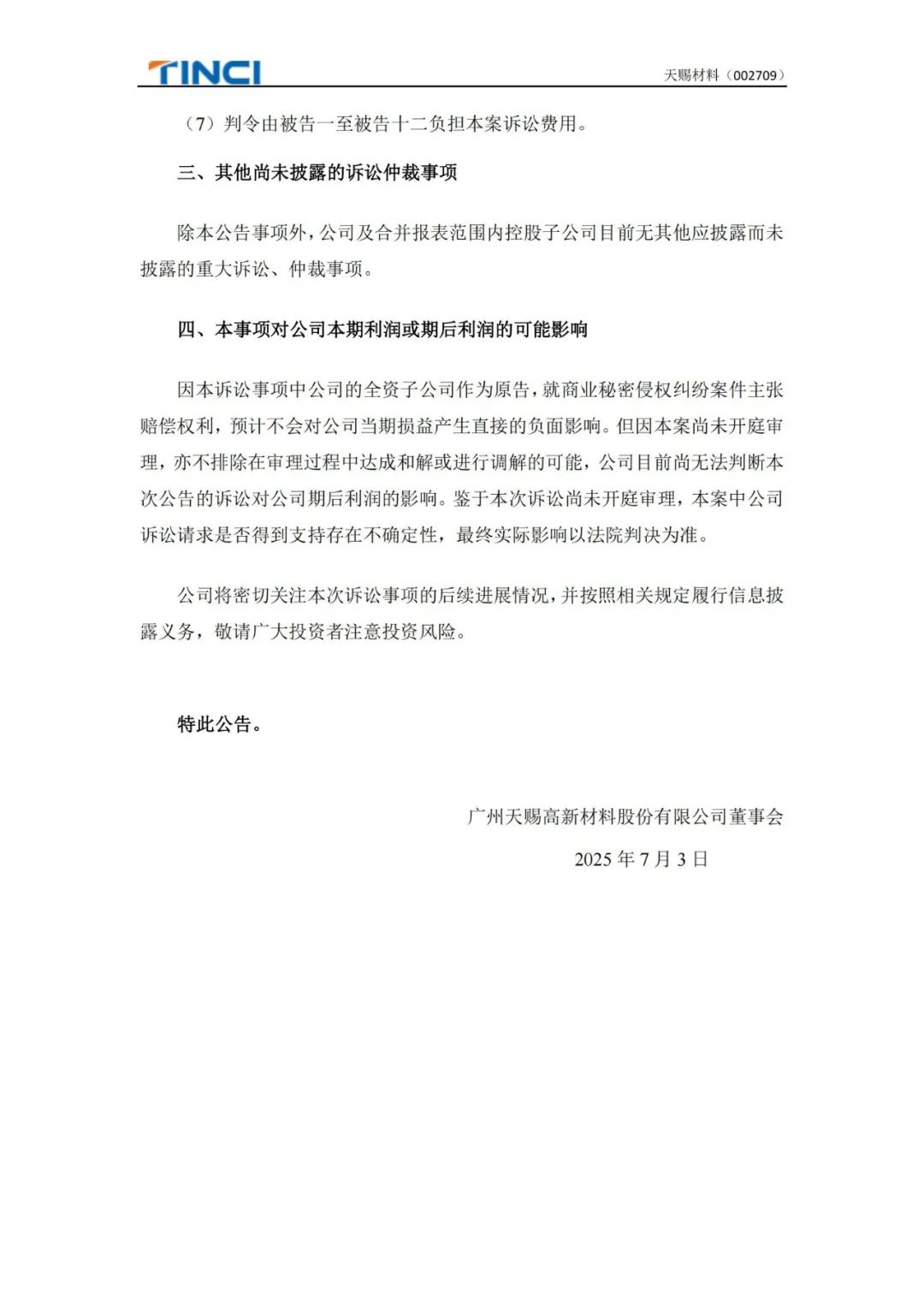 并表示,天赐材料在7月2日发布的公告中所称的侵权产线、技术均是永太高新自行研发,不存在侵害天赐材料商业秘密情形。