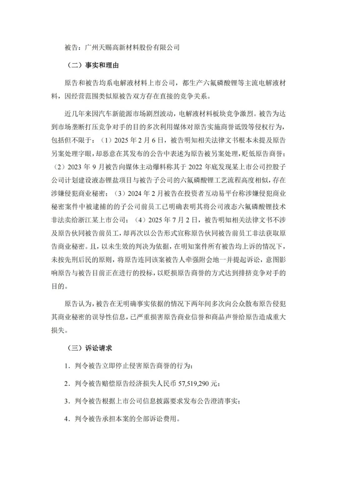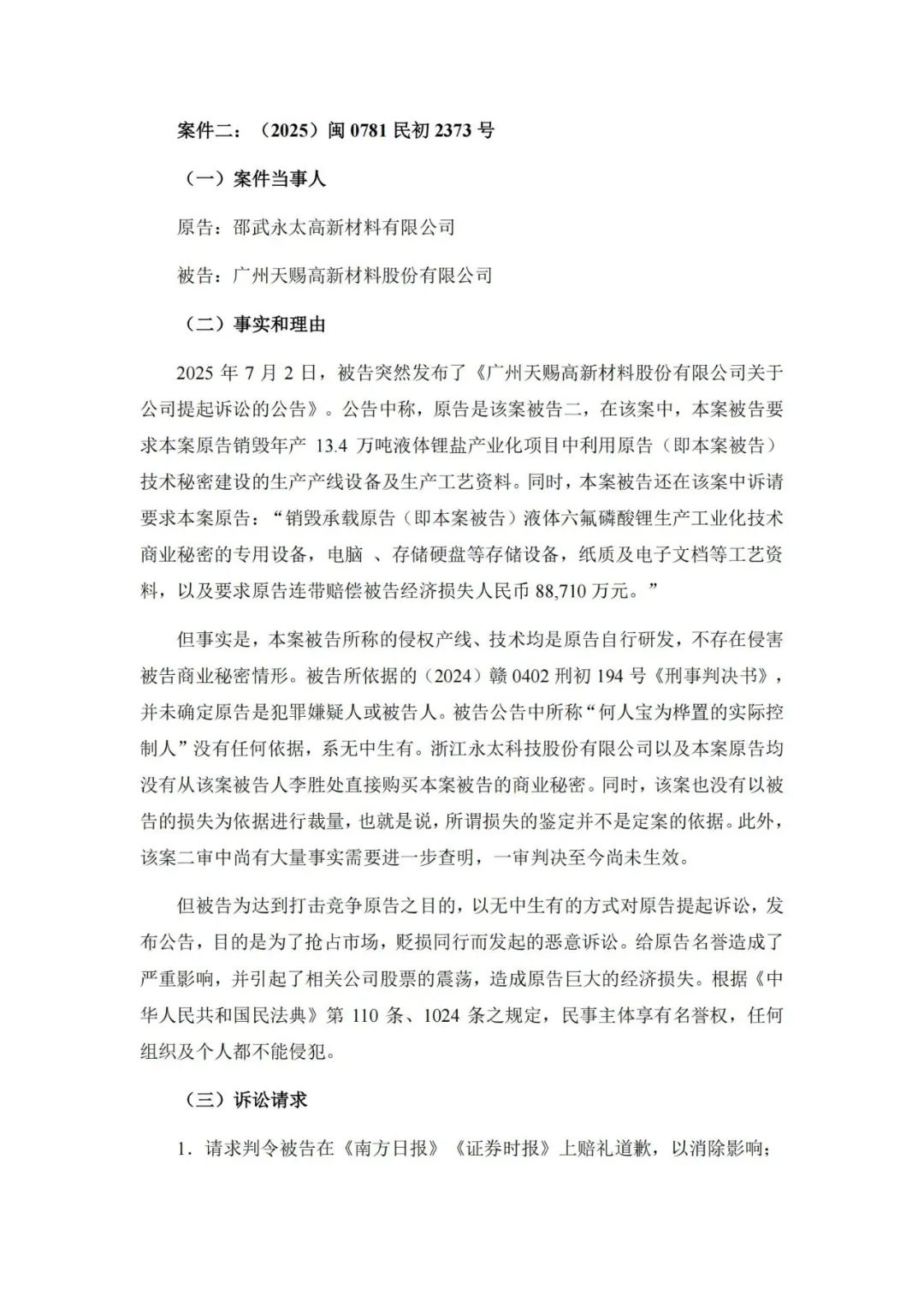 永太科技认为,天赐材料为达到市场垄断打压竞争对手的目的多次对公司实施商誉诋毁等侵权行为,在无明确事实依据的情况下两年间多次向公众散布公司侵犯其商业秘密的误导性信息,已严重损害公司商业信誉和商品声誉给原告造成重大损失。