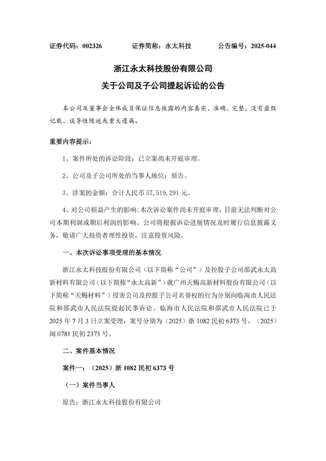 同日晚间,永太科技亦披露诉讼对应公告称,截至目前,公司尚未收到任何涉及该案的诉讼材料。
