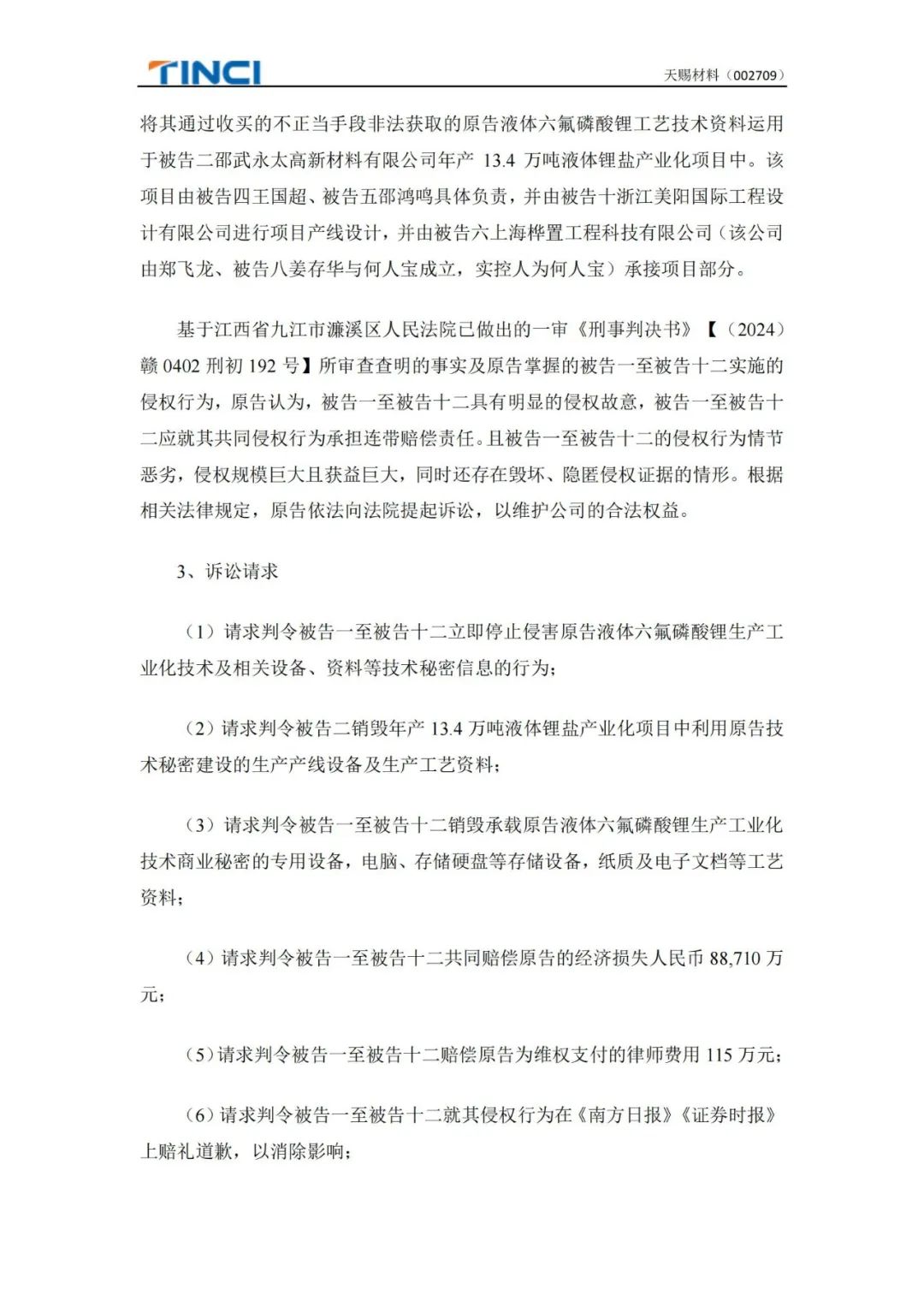 原告请求判令被告一至被告十二立即停止侵害原告液体六氟磷酸锂生产工业化技术及相关设备、资料等技术秘密信息的行为;请求判令被告二销毁年产13.4万吨液体锂盐产业化项目中利用原告技术秘密建设的生产产线设备及生产工艺资料;请求判令被告一至被告十二销毁承载原告液体六氟磷酸锂生产工业化技术商业秘密的专用设备,电脑、存储硬盘等存储设备,纸质及电子文档等工艺资料;请求判令被告一至被告十二共同赔偿原告的经济损失人民币88,710万元;请求判令被告一至被告十二赔偿原告为维权支付的律师费用115万元;请求判令被告一至被告十二就其侵权行为在《南方日报》《证券时报》上赔礼道歉,以消除影响;判令由被告一至被告十二负担本案诉讼费用。