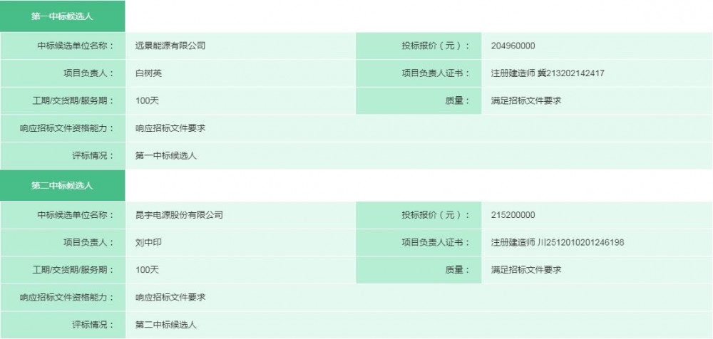 第一中标候选人为远景能源有限公司,投标报价204960000元,折合单价0.854元/wh;第二中标候选人为昆宇电源股份有限公司,投标报价215200000元,折合单价0.897元/wh。