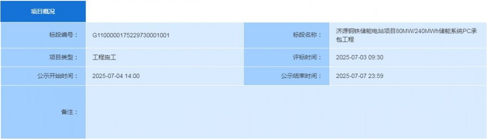 7月4日,济源钢铁储能电站项目80mw/240mwh储能系统pc承包工程评标结果公示。