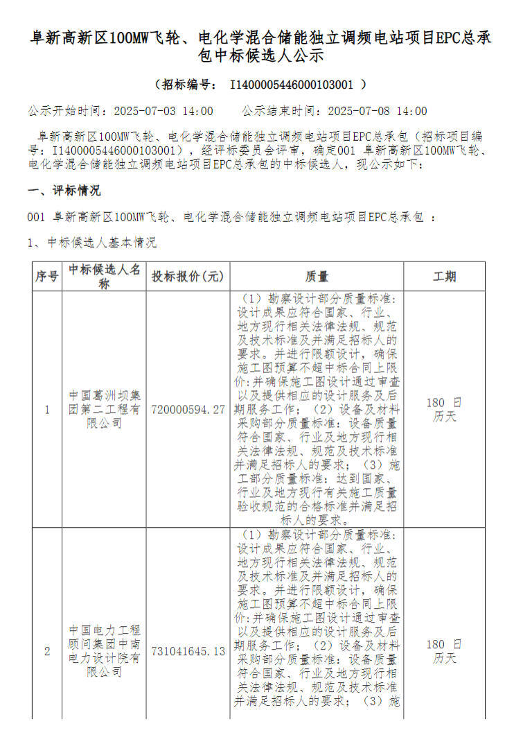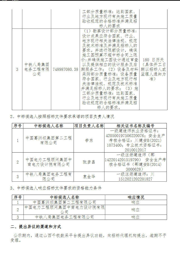第一中标候选人为中国葛洲坝集团第二工程有限公司,投标报价720000594.27元;第一中标候选人为中国电力工程顾问集团中南电力设计院有限公司,投标报价731041645.13元;第一中标候选人为中铁八局集团电务工程有限公司,投标报价748987080.38元。