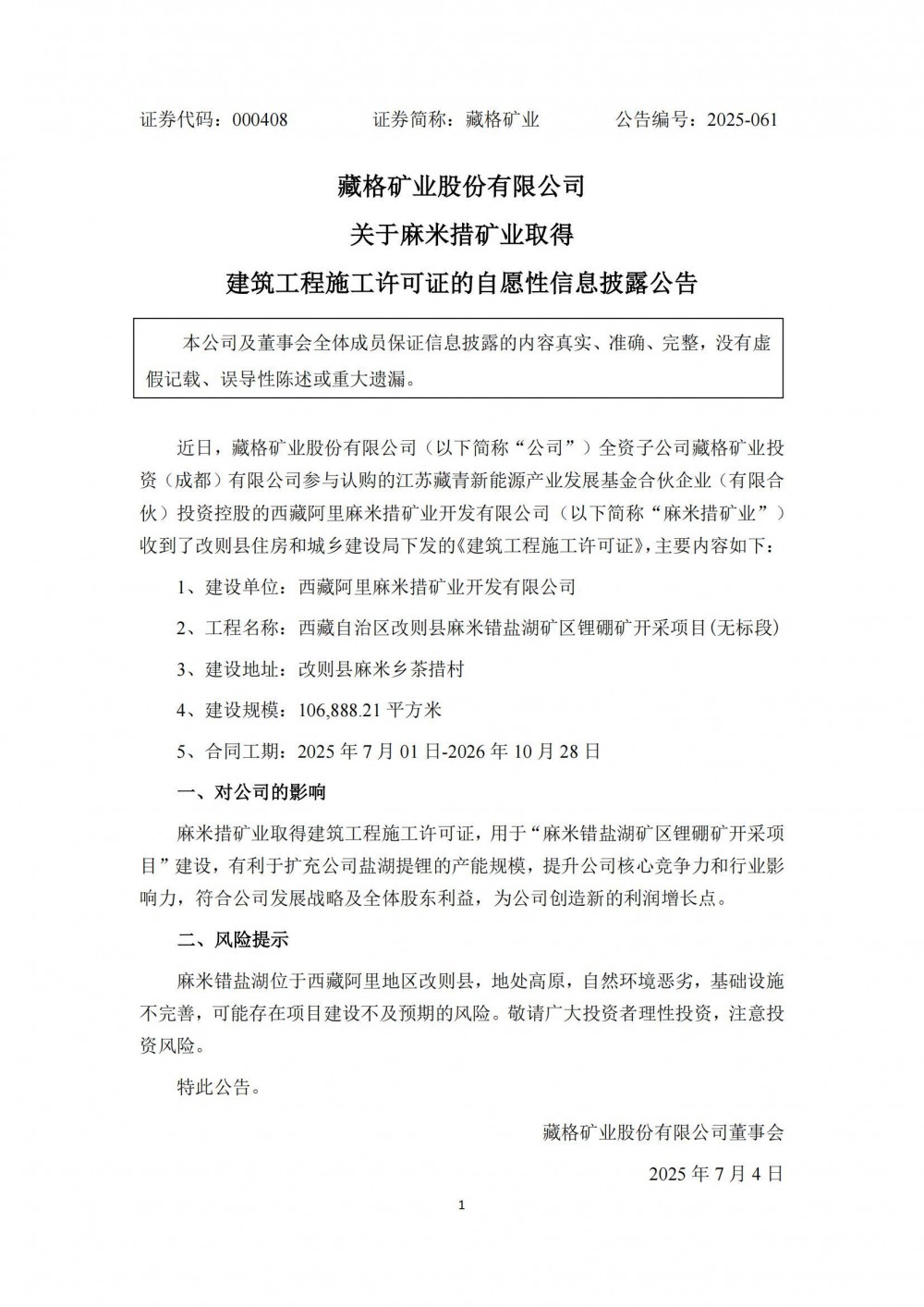 7月3日,藏格矿业发布公告称,公司全资子公司藏格矿业投资(成都)有限公司参与认购的江苏藏青新能源产业发展基金合伙企业(有限合伙)投资控股的西藏阿里麻米措矿业开发有限公司收到了改则县住房和城乡建设局下发的《建筑工程施工许可证》。