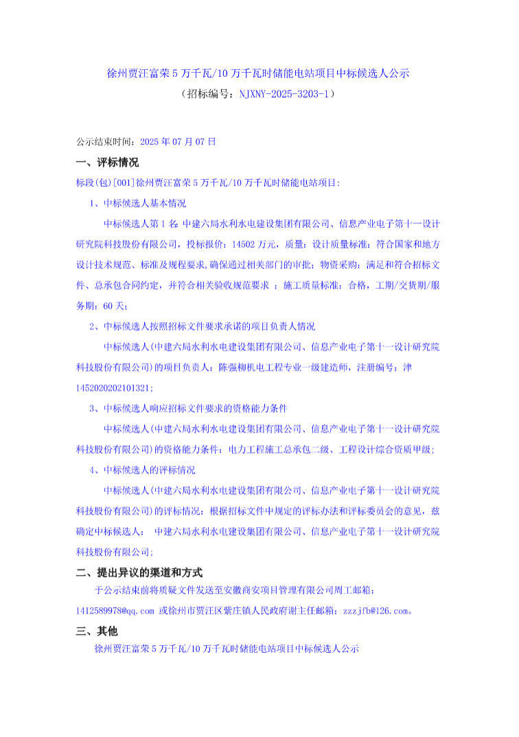 第一中标候选人为中建六局水利水电建设集团有限公司、信息产业电子第十一设计研究院科技股份有限公司,投标报价为14502万元,折合单价1.45元/wh。