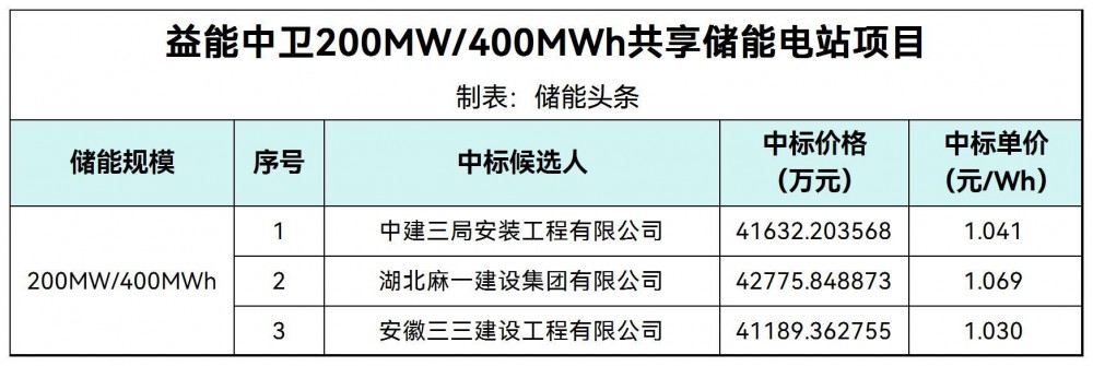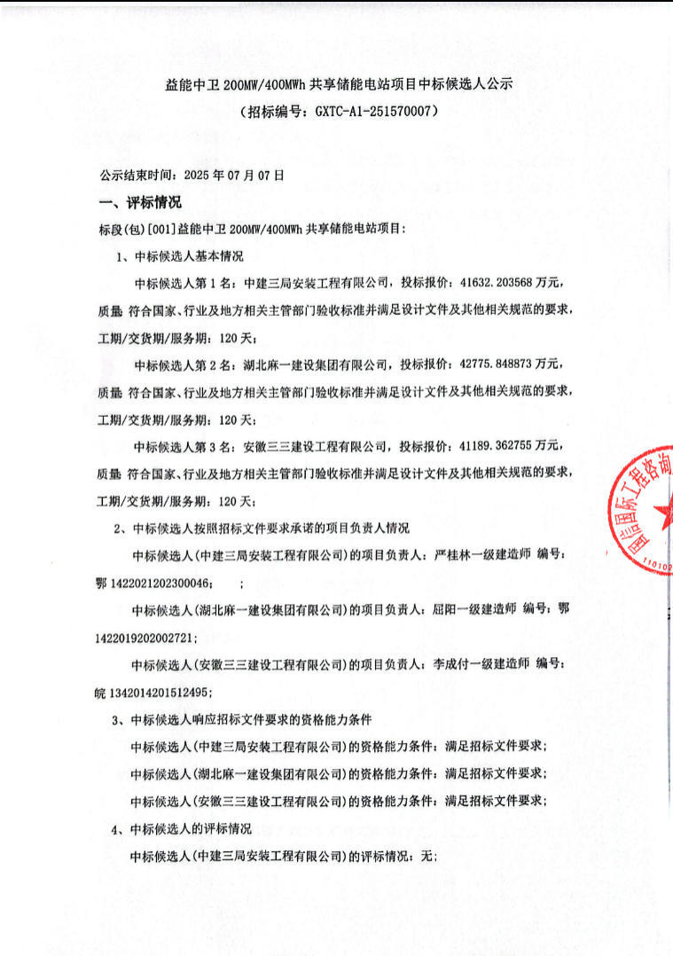 第一中标候选人为中建三局安装工程有限公司,投标报价为41632.203568万元,折合单价1.041元/wh;第二中标候选人为湖北麻一建设集团有限公司,投标报价为42775.848873万元,折合单价1.069元/wh;第三中标候选人为安徽三三建设工程有限公司,投标报价为41189.362755万元,折合单价1.03元/wh。