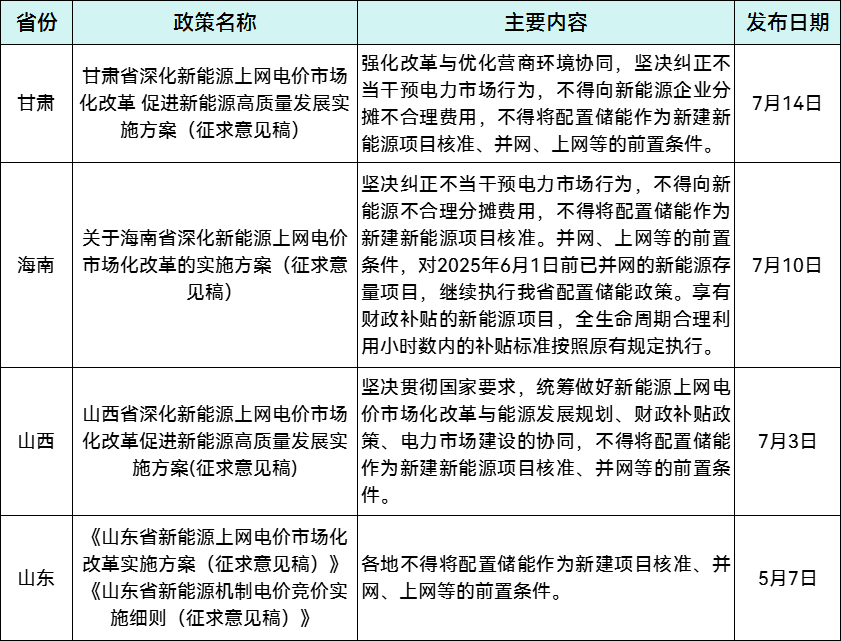 随后,甘肃、海南、山西、山东等地也纷纷下发“136”号文承接文件,也明确提出“不得将配置储能作为新建新能源项目核准、并网、上网等的前置条件”。