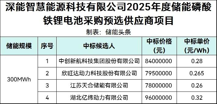 储能头条获悉,7月18日,深能智慧能源科技有限公司2025年度储能磷酸铁锂电池采购预选供应商项目中标候选人公示。