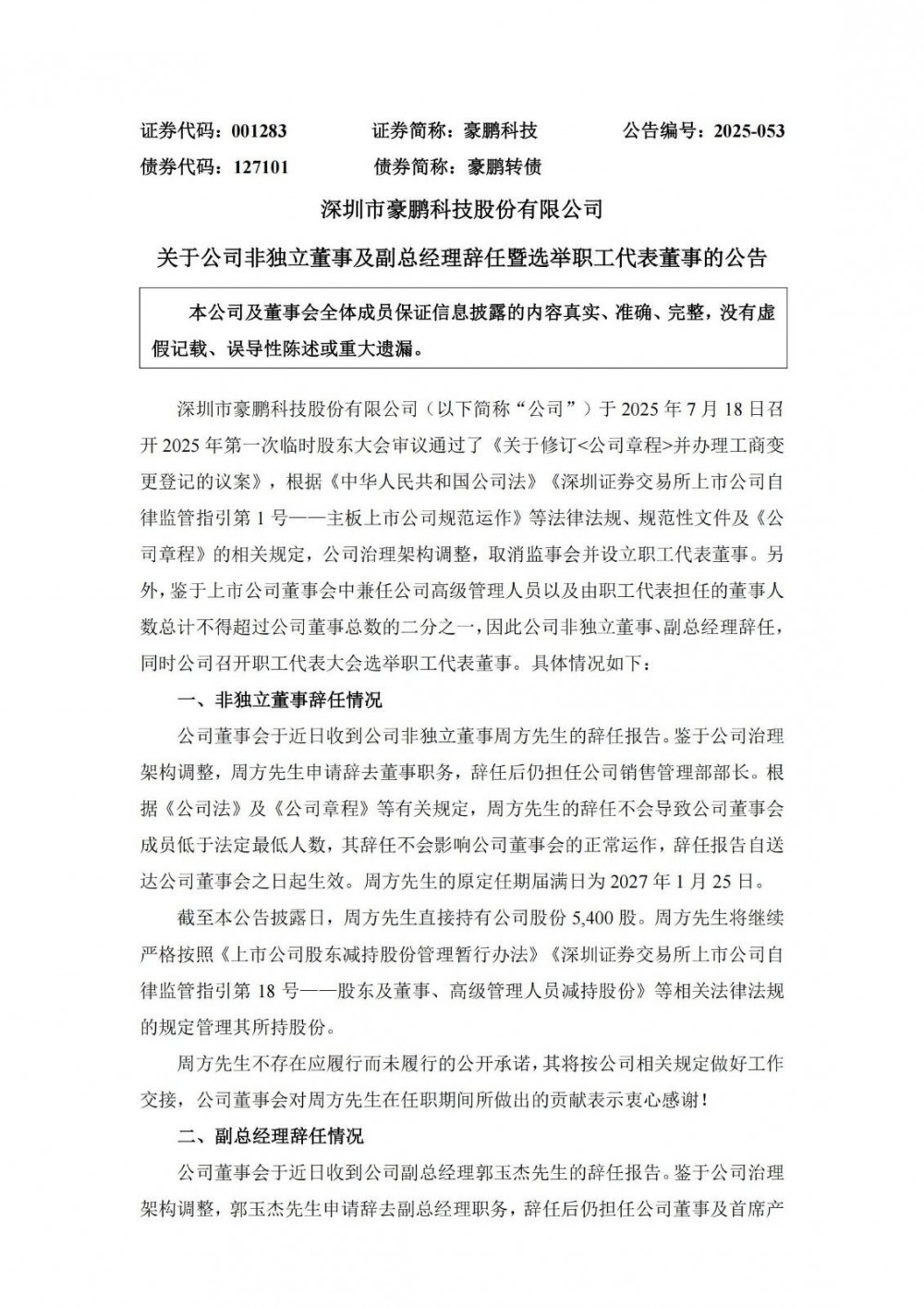 近日,豪鹏科技发布公告称,公司董事会于近日收到公司非独立董事周方先生的辞任报告。鉴于公司治理架构调整,周方先生申请辞去董事职务,辞任后仍担任公司销售管理部部长。