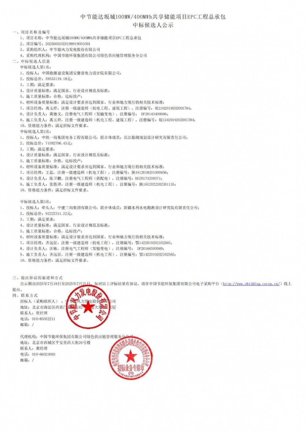 7月18日,中节能达坂城100mw/400mwh共享储能项目epc工程总承包中标候选人公示。