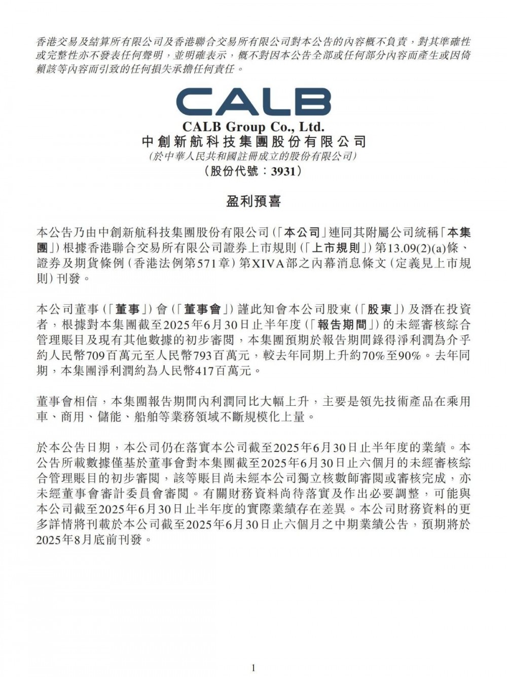 7月23日,中创新航发布公告称,2025年上半年净利润约为709百万元至793百万元,较去年同期上升约70%至90%。去年同期,本集团净利润约为人民币417百万元。